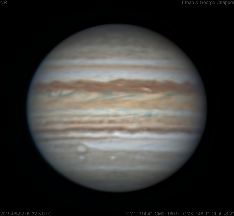 After a successful set of images with the 90mm Mak and no signs of clouds, we decided to take out the C14 while there was time. Turns out that was a really good decision since this is our best RGB image the apparition so far. However, it did end up being disturbed by a thin layer of clouds. Notes: The North North Temperate Belt is showing hints of orange within its otherwise brown clouds. The North Temperate Belt is thin. The southern edge is faintly orange while the north is a thin dark line. There is a white oval on the NEBn at the central meridian. The North Equatorial Belt has a new rift past the CM. The Equatorial Zone, except for the southern edge, is still orange. However, there is a subtle orange smudge at the CM on the EZs. The South Equatorial Belt has a teal spot with a detached tail on its northern edge. I don't recall seeing anything with this color on Jupiter before. The SEBs is dark compared to the rest of the belt. There is a bright spot just off the SEBs on the CM. White Oval BA is rising with the STB Ghost trailing it. There is a subtle blue feature to the west of Oval BA. Is this an STB structured segment? The South Polar Red Spot is setting.