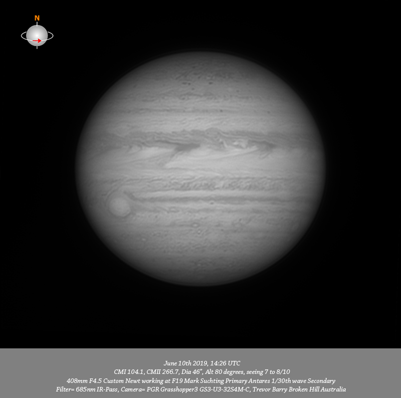 685nm-Pass IR data. Jupiter at opposition. Very hi-res particularly down the down stream structure from the material ejected from the eye of the GRS.