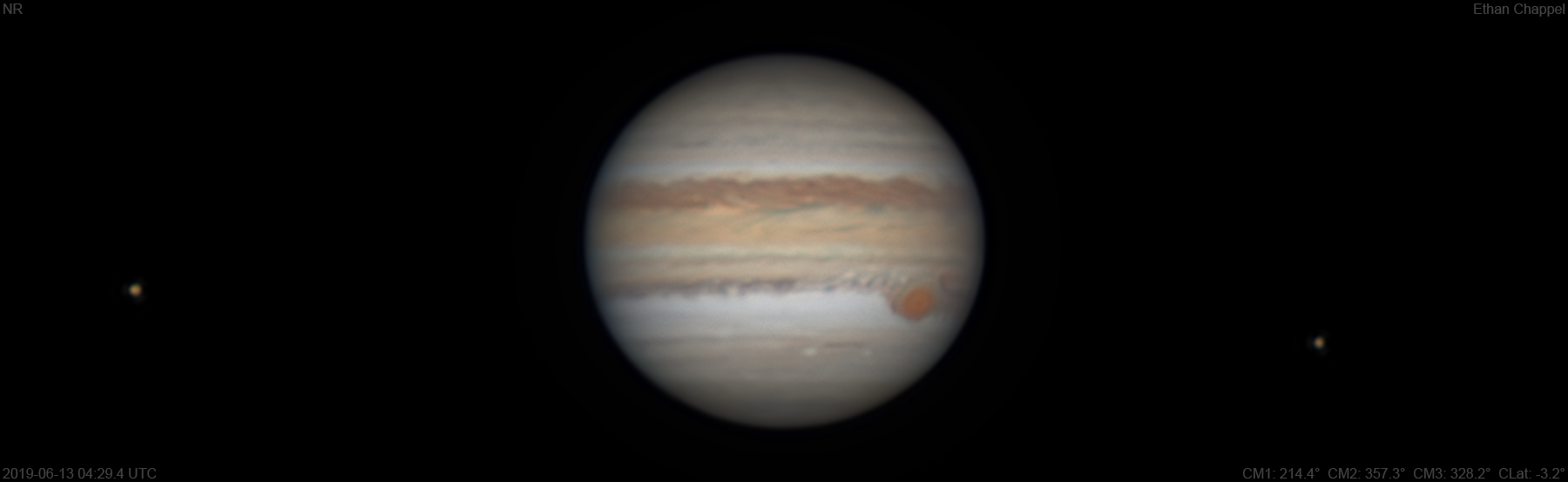 After taking an image with my usual C8 imaging train with ZWO filters, I swapped it out for the C14 train with Chroma filters. Seeing was still turbulent but slow enough to see a decent amount of details. Notes: White Oval Z is setting. The Equatorial Zone is orange. The Great Red Spot is off-center in its hollow. The GRS hollow is unusually dark. South Equatorial Belt clouds are circulating around the GRS and into the South Tropical Zone to the east. The SEBs is dark and clumpy. Io and Europa appear left and right of the planet respectively.