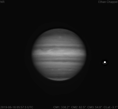 To round out Jupiter imaging for the night, I decided to capture a methane image to reveal the altitude of clouds. Notes: There is a bright spot on the central meridian at mid-northern latitudes. As far as I can tell, this spot is almost indistinguishable in visible light and faintly outlined in deep-red/infrared. The southern edge of the Equatorial Zone is darker than the rest. The South Equatorial Belt is split by a zone.