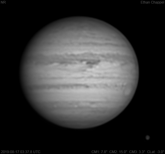 A decent return to imaging Jupiter after missing a few to bad weather. Notes: The northern Equatorial Zone has a hot-spot at the central meridian. The northern South Equatorial Belt is pale. The Great Red Spot is setting. Callisto is approaching Jupiter.