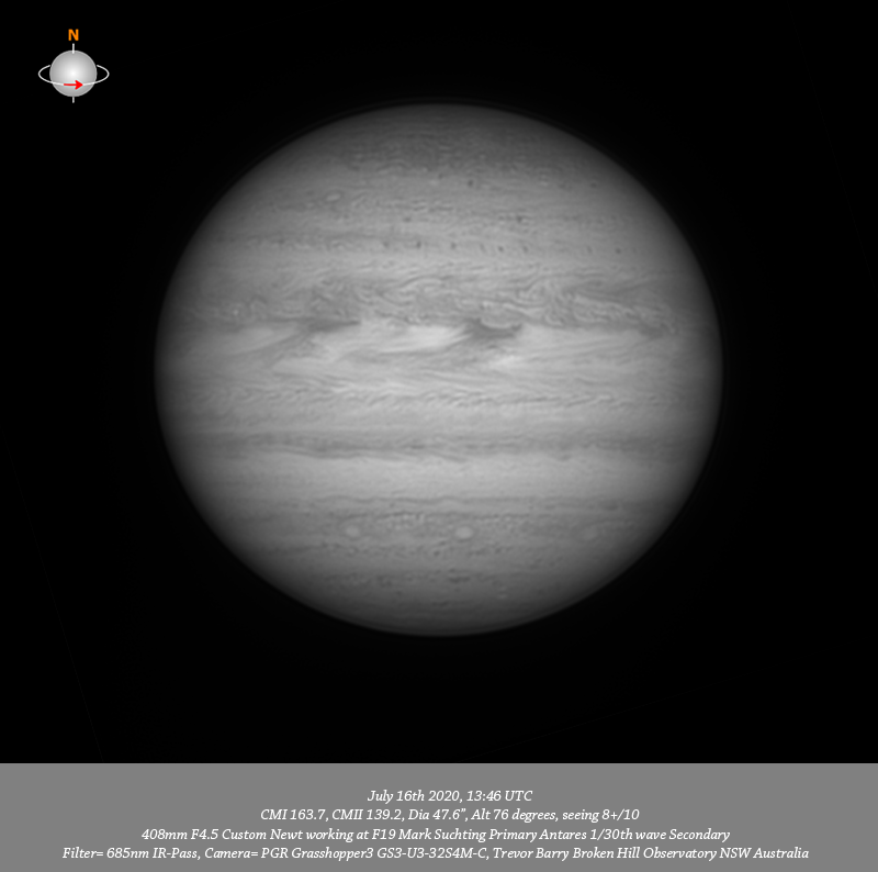685nm IR data. Imaged Jupiter July 16th in good seeing, have exceptional data, arguably my best Jupiter data for this apparition. Stacked 100% of the Ch4 data and 80% to 90% of all 685nm IR, R, G & B data. Have great depth of resolved detail from pole to pole and limb to limb, the fine detail that was visible in the live feed was extraordinary. I note two very small bright ovals near the CM on the edge of the NPR. There is a small bright oval between the F limb and CM in the NNTB. A formation of tiny dark spots are resolved spread across the NTB from limb to limb. The intricate structure within the NEB is very well resolved at all wavelengths. Two dark most extravagant festoons stream from the Southern edge of the NEB back through the EZ. Most delicate structure is seen across the EZ and in a band across the Northern edge of the SEB. I note a red barge near the CM just toward the P limb. There is considerable very fine resolved detail in the SSTB including a line of three bright ovals and there is an assortment of tiny dark spots within the SPR.