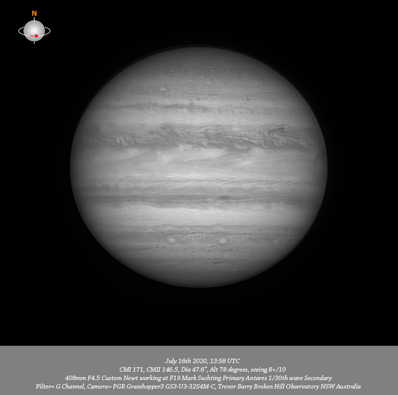 G channel data. Imaged Jupiter July 16th in good seeing, have exceptional data, arguably my best Jupiter data for this apparition. Stacked 100% of the Ch4 data and 80% to 90% of all 685nm IR, R, G & B data. Have great depth of resolved detail from pole to pole and limb to limb, the fine detail that was visible in the live feed was extraordinary. I note two very small bright ovals near the CM on the edge of the NPR. There is a small bright oval between the F limb and CM in the NNTB. A formation of tiny dark spots are resolved spread across the NTB from limb to limb. The intricate structure within the NEB is very well resolved at all wavelengths. Two dark most extravagant festoons stream from the Southern edge of the NEB back through the EZ. Most delicate structure is seen across the EZ and in a band across the Northern edge of the SEB. I note a red barge near the CM just toward the P limb. There is considerable very fine resolved detail in the SSTB including a line of three bright ovals and there is an assortment of tiny dark spots within the SPR.