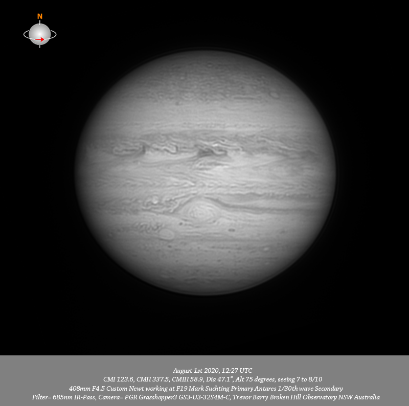 - 685nm IR data. Imaged Jupiter August 1st in good seeing have very good depth of resolved detail everywhere. I note a prominent red oval near the P limb in the NNTB which would likely be LRS-1; following this oval is a very prominent very thin dark strip. Many quite tiny bright spots in the NPR are well resolved particularly in 685nm IR and R data. Very delicate structure is seen along the Northern edge of the NEB, particularly in the B channel data. Quite intricate structure is resolved through the NEB from limb to limb with a very bright spot seen to the P side of the CM at all wavelengths. Three prominent dark features are spaced across the Southern edge of the NEB associated with festoons. Intricate structure is resolved in the EZ in IR and R channel data. Intricate detail is resolved in a thin band along the EZ SEB border. The disturbed region following the GRS in the SEB is very well resolved with a prominent bright spot within it resolved at all wavelengths. Circulation is seen within the GRS with a line of at least three tiny dark spots very near the Southern edge of the GRS; another tiny dark spot is on the actual trailing edge of the GRS with other tiny dark spots on the P edge. Clydes spot is resolved toward the P limb in the STB. DS6 is very well resolved in the STB preceding the GRS. As Bird noted in his data from the same date, DS6 clearly has two components they are well resolved as two separate components in the IR, R, G, B and RGB data from this session. Oval BA is well resolved in the STB as is the disturbed region following it with a very small bright oval (STZ-AWO) close to the F limb. The small bright oval (A8) is resolved toward the P limb in the SSTB. Many tiny dark spots are resolved in the SPR.