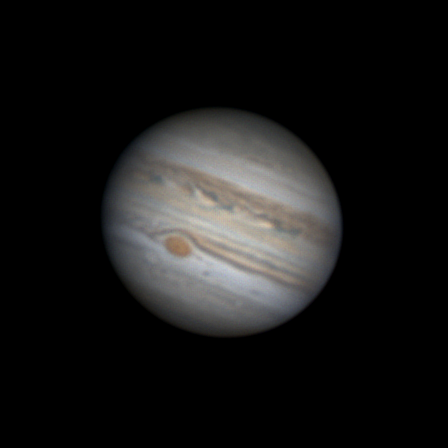 Jupiter with GRS observed from New Delhi Skies, using 8" Skywatcher Collapsible Dobsonian, ZWO ASI178MC, 2xCelestron Barlow, Manual Tracking Processed in PIPP, ASi & Registax