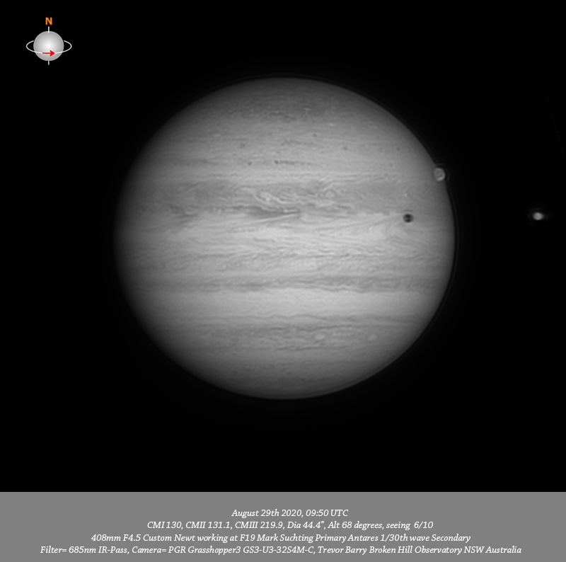 685nm IR data. Imaged Jupiter August 29th in fair at best seeing, that said have reasonable 685nm IR and R channel data. Ganymede was transiting at the start of the session while Io’s shadow was also in transit. Have some fine detail within the NPR and the structure within the NEB is reasonably well resolved. Two prominent bright ovals are resolved in all data in the NNTeB.