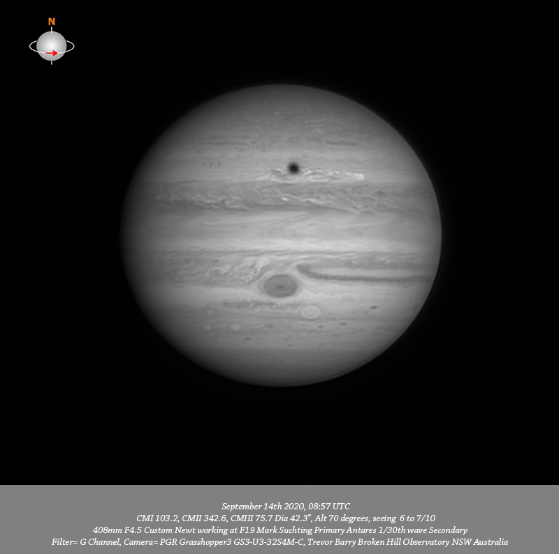 G channel data. Imaged Jupiter September 14th in good seeing. Have a good depth of resolved detail across the field. I note a v-thin red band toward the P limb on the Southern edge of the NPR, many v-fine details are resolved within the NPR. There is a shadow transit of Callisto within the wake of the #2 outburst. Quite intricate structure is resolved within the NEB and the is a v-compact bright spot near the CM.Three dark features along the Southern edge of the NEB associated with festoons are seen, most prominent in IR. The GRS chimney remains open and circulation can be seen within the GRS. The disturbed region immediately following the GRS is very well resolved. DS6 resolves as two separate dark spots, Oval BA is well resolved as is it’s fine inner ring. The disturbed region following Oval BA is well resolved as is STZ-AWO. Bright ovals A1 and A2 are seen in the SSTeB and red oval S4-LRS-1 is resolved near the CM within the SPR.