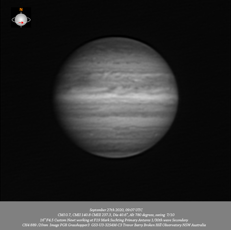 CH4 data. Imaged Jupiter September 27th in quite stable seeing. Have good coverage of outburst #2 with the head of it very near the CM mid session. It is most interesting that the head of #2 and much of the trailing material dredged up by it are well seen in the G data and UV but best seen in the B data. Interestingly it is resolved to some extent in the CH4, 685nm IR and R data but just not as apparent as it is in G, B & UV. Although these are not great data considering the significance of how #2 is evolving I have included all individual channels.