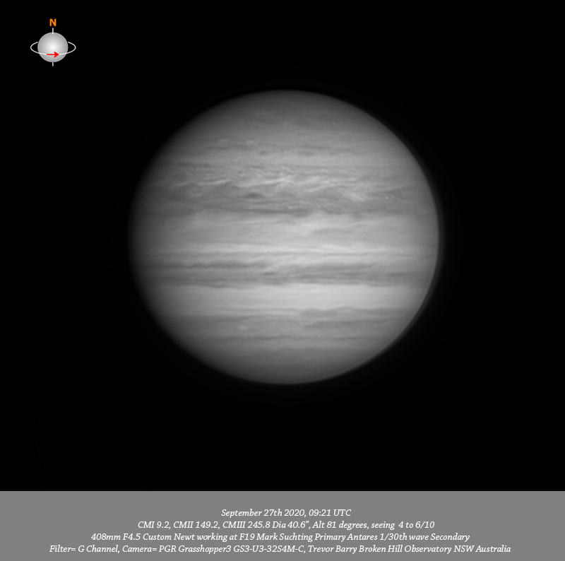G channel data. Imaged Jupiter September 27th in quite stable seeing. Have good coverage of outburst #2 with the head of it very near the CM mid session. It is most interesting that the head of #2 and much of the trailing material dredged up by it are well seen in the G data and UV but best seen in the B data. Interestingly it is resolved to some extent in the CH4, 685nm IR and R data but just not as apparent as it is in G, B & UV. Although these are not great data considering the significance of how #2 is evolving I have included all individual channels.
