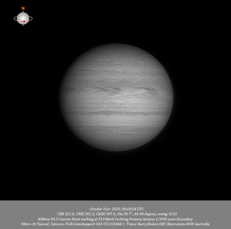 R channel data. Imaged Jupiter October 31st in mostly good seeing. I note a diffuse bright oval on the Southern edge of the NPR toward the P limb. Quite intricate structure is resolved throughout the NEB with three dark features spaced along it’s Southern edge associated with festoons in the EZ. The reddish colouring over a significant portion of the EZ is very apparent in the RGB data. The G and B data in particular show most of the EZ as being shaded with only a thin strip of the EZ along it’s border with the SEB being it’s normal lighter colour. The SEB has very thin bands containing very fine structure along both it’s Northern and Southern edges. Several faint spots are seen to be rotating in from the F limb within the STZ. A small bright oval is resolved in the SSTeB near the CM