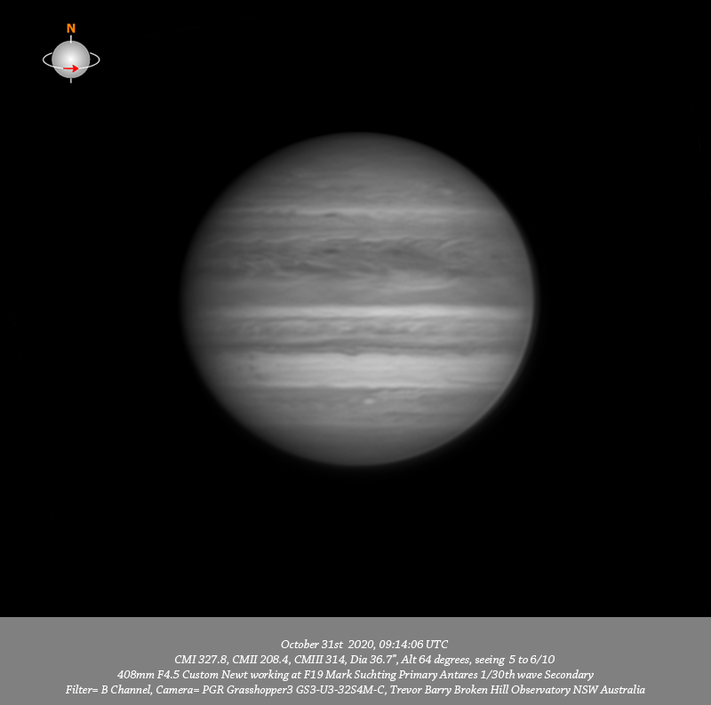 B channel data.Imaged Jupiter October 31st in mostly good seeing. I note a diffuse bright oval on the Southern edge of the NPR toward the P limb. Quite intricate structure is resolved throughout the NEB with three dark features spaced along it’s Southern edge associated with festoons in the EZ. The reddish colouring over a significant portion of the EZ is very apparent in the RGB data. The G and B data in particular show most of the EZ as being shaded with only a thin strip of the EZ along it’s border with the SEB being it’s normal lighter colour. The SEB has very thin bands containing very fine structure along both it’s Northern and Southern edges. Several faint spots are seen to be rotating in from the F limb within the STZ. A small bright oval is resolved in the SSTeB near the CM