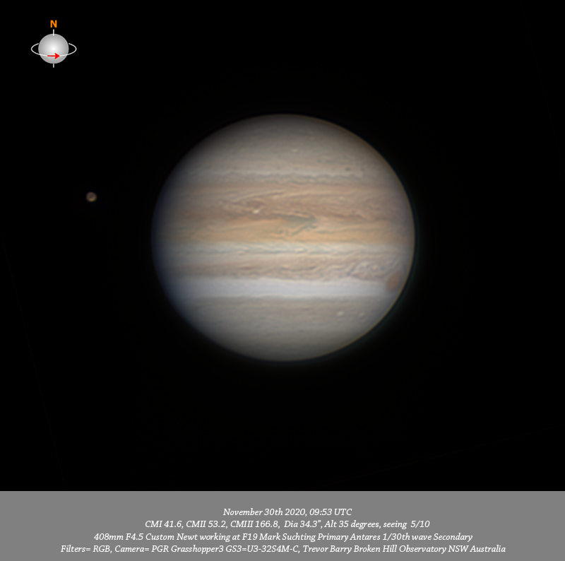 RGB data. Imaged Jupiter November 30th in reasonable seeing. Have good depth of resolved detail across the field. There is a considerable amount of fine detail resolved within the NPR including a dark thin linear feature near the pole and a v-small bright spot on the Southern edge of the NPR. Many compact dark spots are resolved in the NNTeB. These data well resolve the fine structure within the NEB including a compact bright near the Southern edge of the NEB and two of the very dark linear features also along the Southern edge of the NEB. A good depth of fine detail is seen within the EZ which still has a reddish colour. The turbulent region following the GRS is well resolved including a compact bright and compact dark spot immediately following it. Two small white ovals are resolved in the SSTeB.
