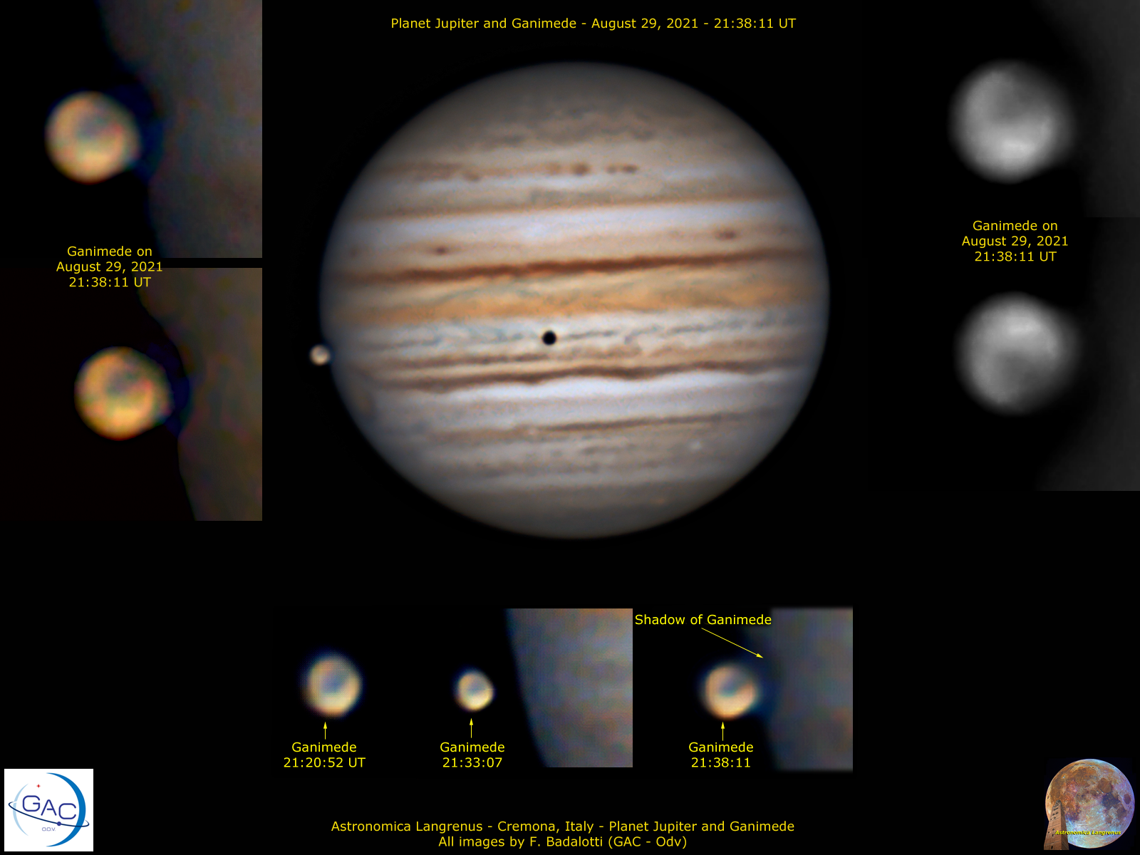 These images of Jupiter and Ganimede was captured on August 29, 2021 from city of Cremona (Northern Italy) through a 255mm F20 Maksutov Rumak telescope with Zwo ASI 224MC CMOS camera, IR Blocking filter and ADC Corrector. Video of 120sec at 30 fps with Sharpcap, was stacked 1800/3600 frames. Images processed with Astrosurface, registax, Fitswork, Camera Raw.