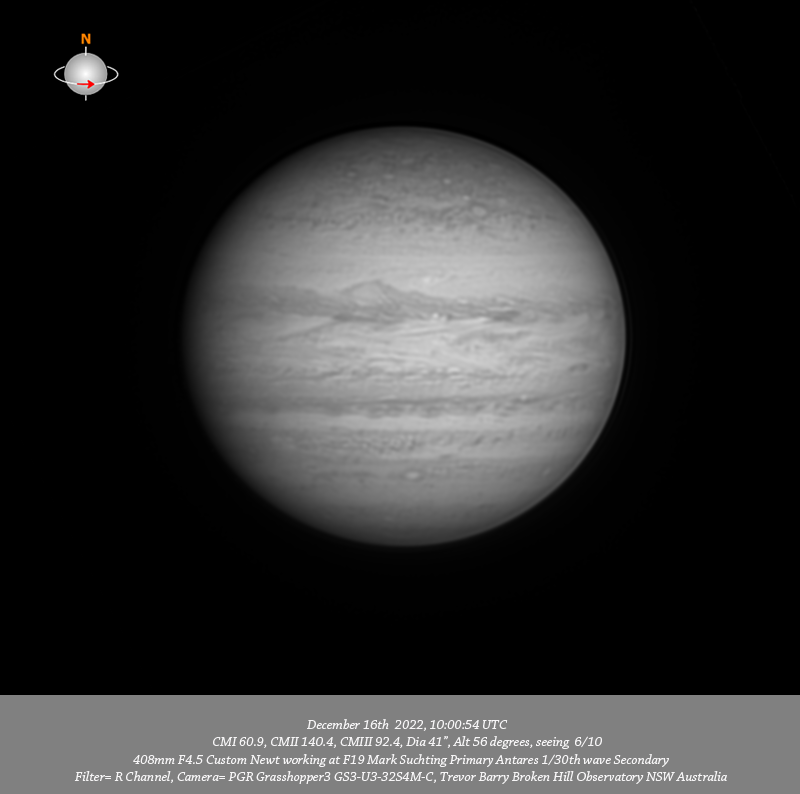 R channel data. Imaged Jupiter December 16th 2022, the day after PJ47 flyby. The track of the flyby is very near the F limb in the final 685nm IR data set of this session. Considerable small scale detail is resolved particularly in the IR and R data including several small red spots within the NPR with NN-WS-6 very prominent. Of particular interest a compact bright spot WS-B is well resolved in the NTrZ and is very closely preceded by another v-small compact bright spot.