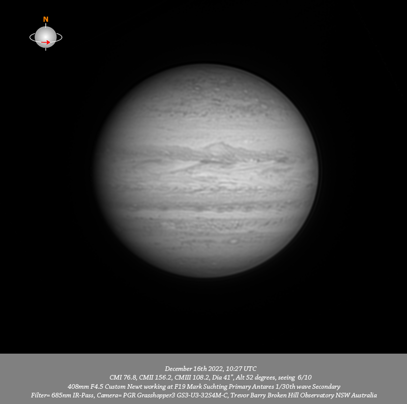 685nm IR data. Imaged Jupiter December 16th 2022, the day after PJ47 flyby. The track of the flyby is very near the F limb in the final 685nm IR data set of this session. Considerable small scale detail is resolved particularly in the IR and R data including several small red spots within the NPR with NN-WS-6 very prominent. Of particular interest a compact bright spot WS-B is well resolved in the NTrZ and is very closely preceded by another v-small compact bright spot.