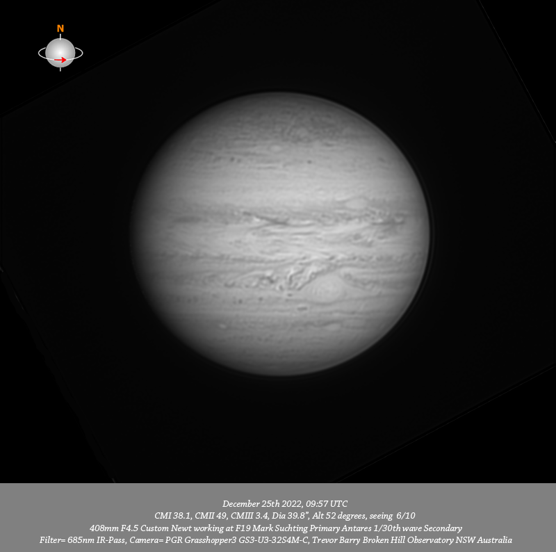 685nm IR data. Imaged Jupiter December 25th in good seeing, a rather nice Christmas present. Have very small scale detail across the entire planet at all wavelengths. The 685nm IR and Methane data were the standouts for the session. Of particular interest is a v-compact dark spot trailing the GRS in the middle of the SEB well seen in IR and very prominent in Methane.