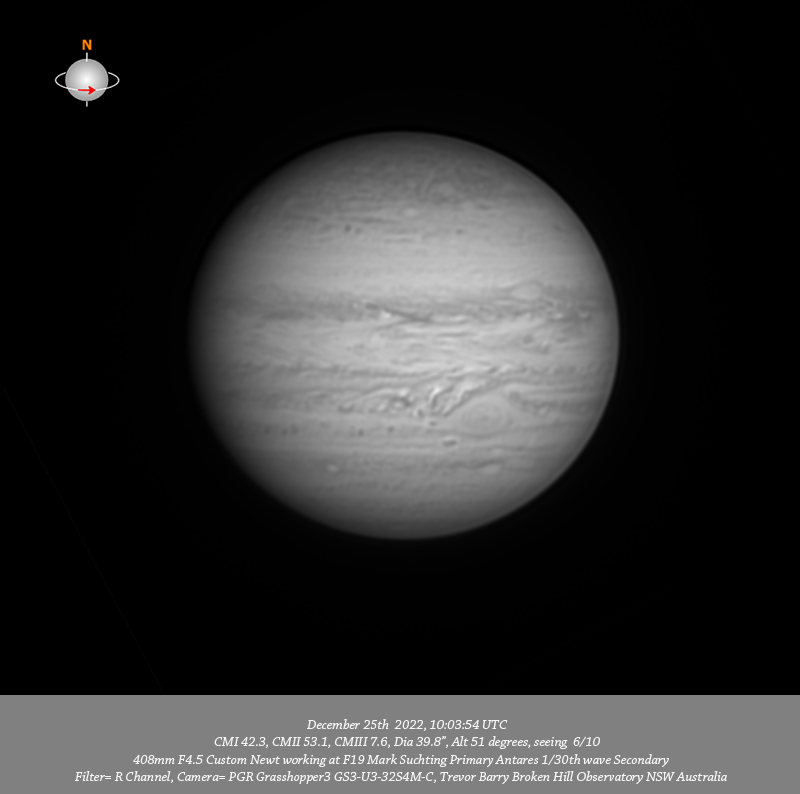 R channel data. Imaged Jupiter December 25th in good seeing, a rather nice Christmas present. Have very small scale detail across the entire planet at all wavelengths. The 685nm IR and Methane data were the standouts for the session. Of particular interest is a v-compact dark spot trailing the GRS in the middle of the SEB well seen in IR and very prominent in Methane.