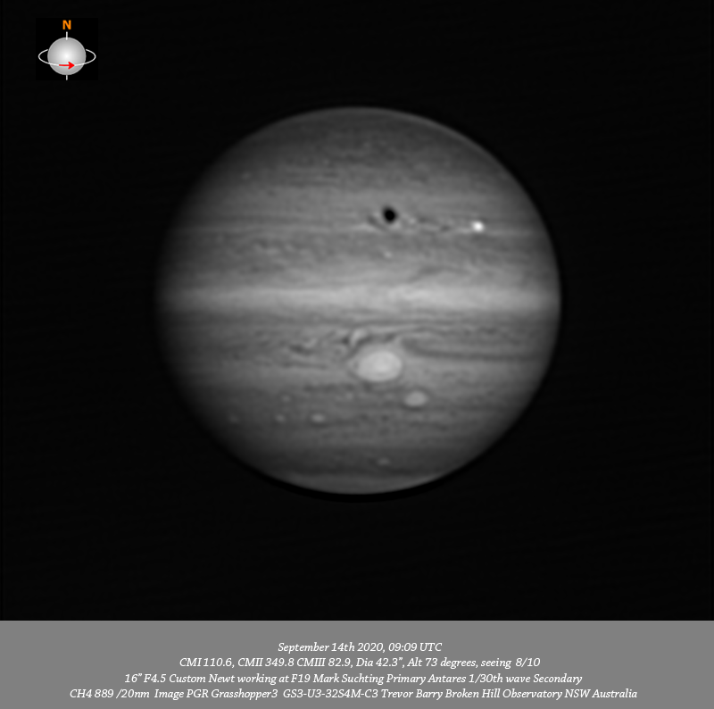CH4 data. Imaged Jupiter September 14th in good seeing. Have a good depth of resolved detail across the field. I note a v-thin red band toward the P limb on the Southern edge of the NPR, many v-fine details are resolved within the NPR. There is a shadow transit of Callisto within the wake of the #2 outburst. Quite intricate structure is resolved within the NEB and the is a v-compact bright spot near the CM.Three dark features along the Southern edge of the NEB associated with festoons are seen, most prominent in IR. The GRS chimney remains open and circulation can be seen within the GRS. The disturbed region immediately following the GRS is very well resolved. DS6 resolves as two separate dark spots, Oval BA is well resolved as is it’s fine inner ring. The disturbed region following Oval BA is well resolved as is STZ-AWO. Bright ovals A1 and A2 are seen in the SSTeB and red oval S4-LRS-1 is resolved near the CM within the SPR.