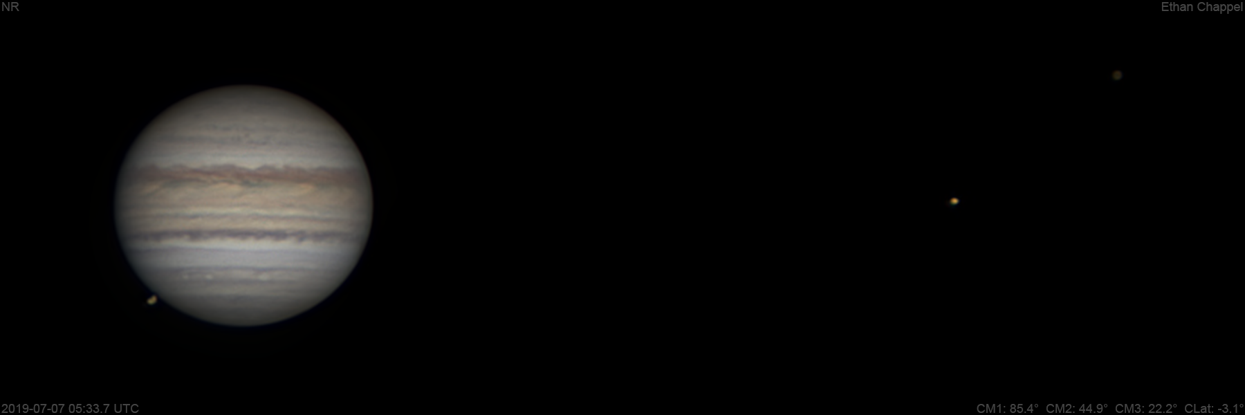 After finishing with Saturn, I saw that Ganymede would emerge from occultation, then quickly hide again in Jupiter's shadow. I decided to catch the event. Notes: The EZ is orange. The SEBs is dark and clumpy. Ganymede is partially eclipsed in Jupiter's shadow.