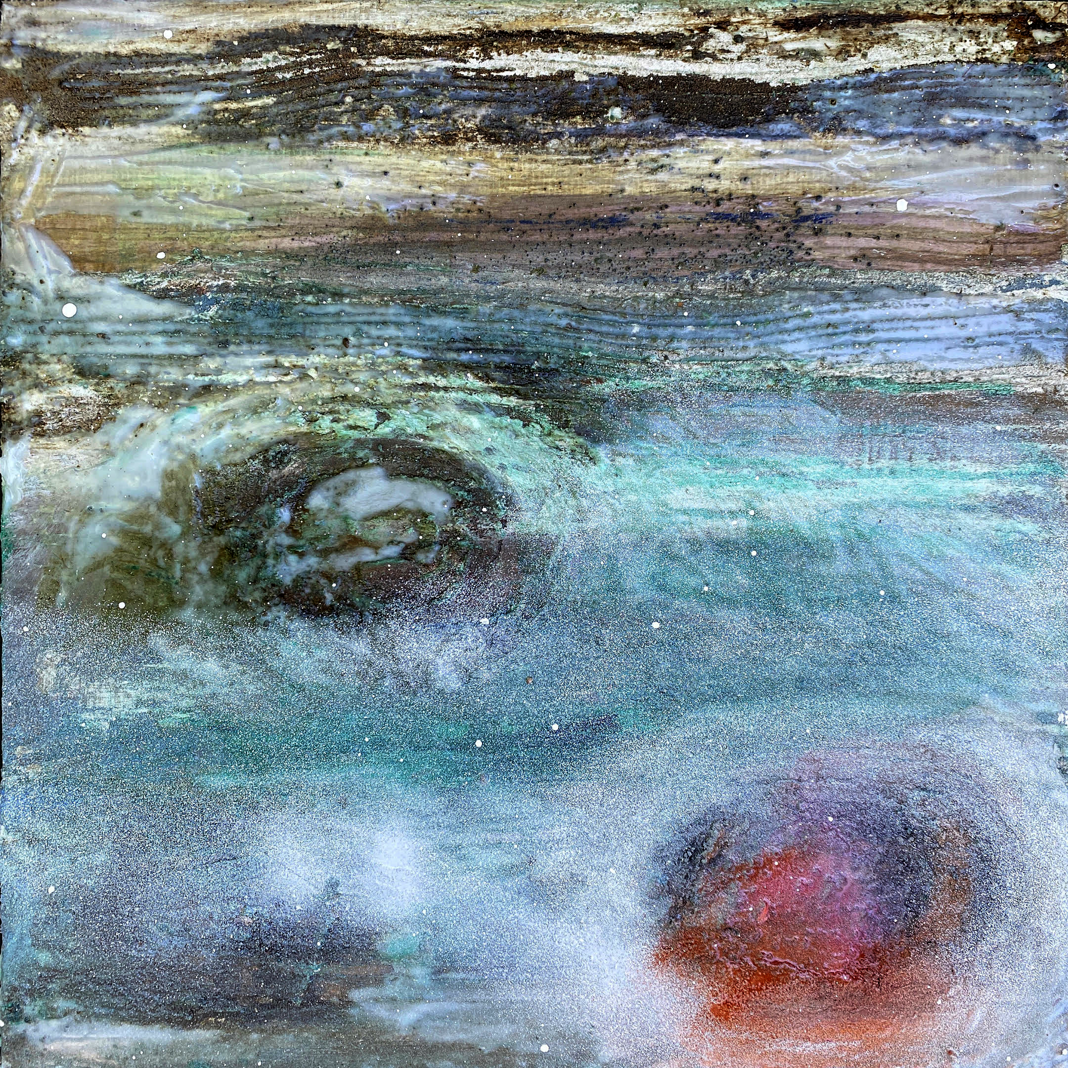 Visualized Translation. Contemporary Artist Erin McGee Ferrell. 24 x 24 inches. Mixed Media on wood. www.ArtistAMERICAN.com 2021