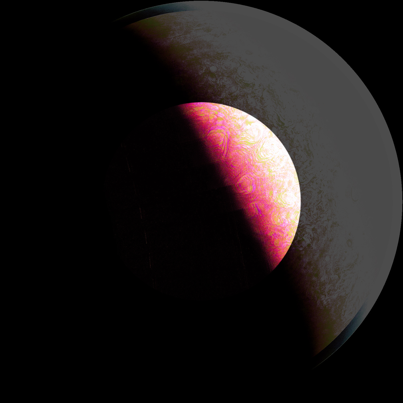 Junocam pixels are 12 bits deep from the camera but are converted to 8 bits inside the instrument using a lossless "companding" table, a process similar to gamma correction, to reduce their size. All Junocam products on the missionjuno website are in this 8-bit form as received on Earth. Scientific users interested in radiometric analysis should use the "RDR" data products archived with the Planetary Data System, which have been converted back to a linear 12-bit scale.