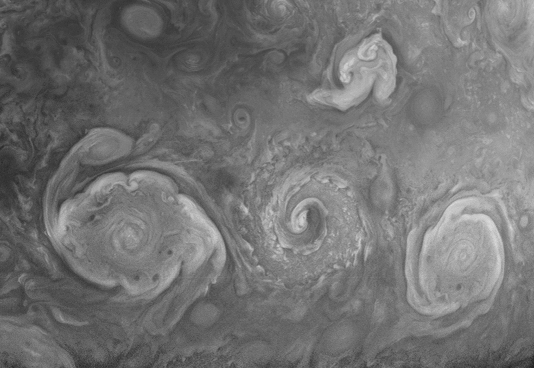 Northern circumpolar cyclones in detail - Greyscale. Processed from the RAW PJ34-44 image.