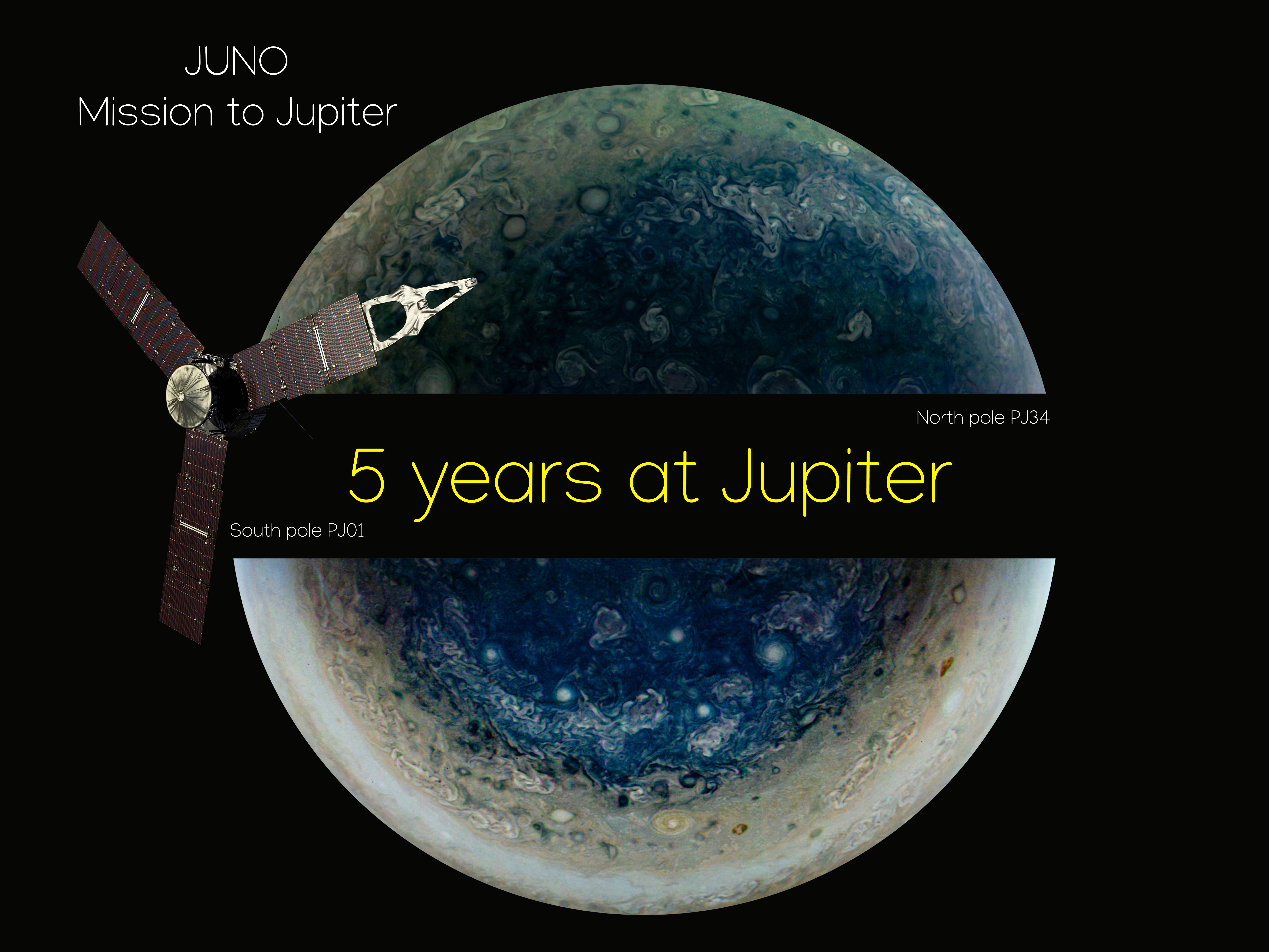 Celebrating 5 Years at Jupiter - South pole on PJ01 to North pole on PJ34.