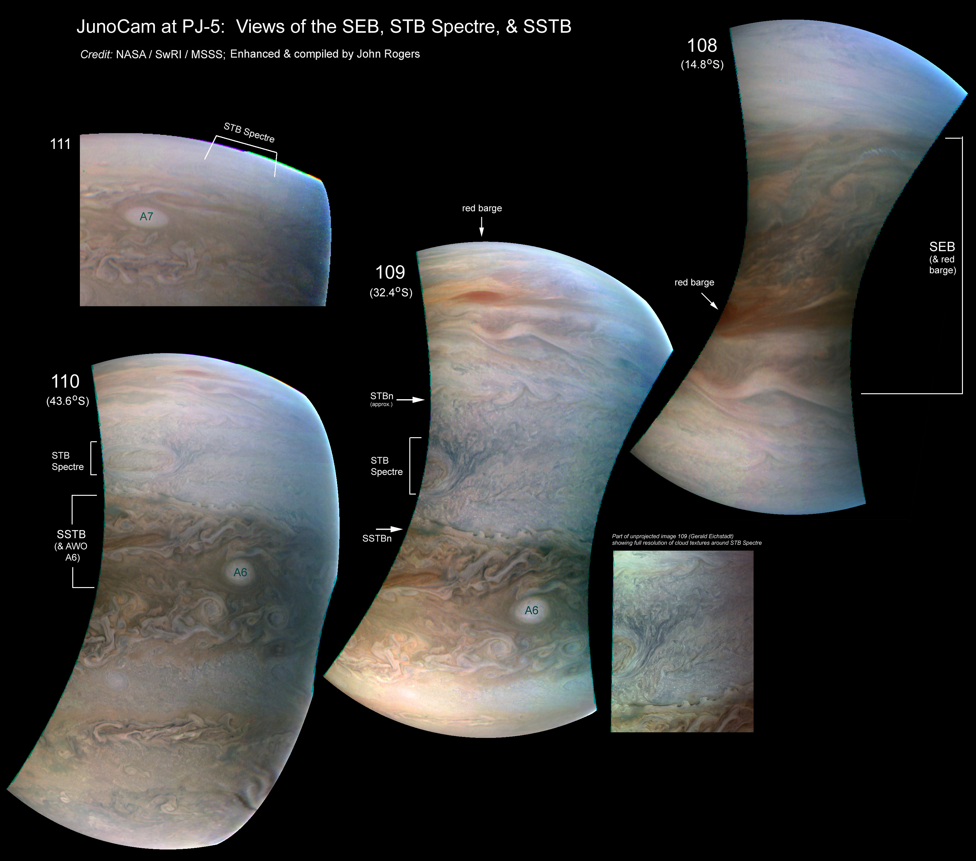 This is a labelled montage of images 108-110. The SEB was targetted in image 108. It shows a fairly quiet sector, which makes a nice comparison with the previous images of highly turbulent sectors, and it includes a red mini-barge. The STB Spectre was successfully captured (in part) in the targetted image 109, and more of it in the adjacent image 110. These beautiful closeups are shown in Figure 7. They show an impressive circulation pattern which clearly indicates the cyclonic circulation of its central oval, as well as many tiny, very bright clouds scattered in the surrounding zones. Images 109 and 110 also captured two of the AWOs in the SSTB (“String of pearls”), plus the surrounding turbulence. --John Rogers.