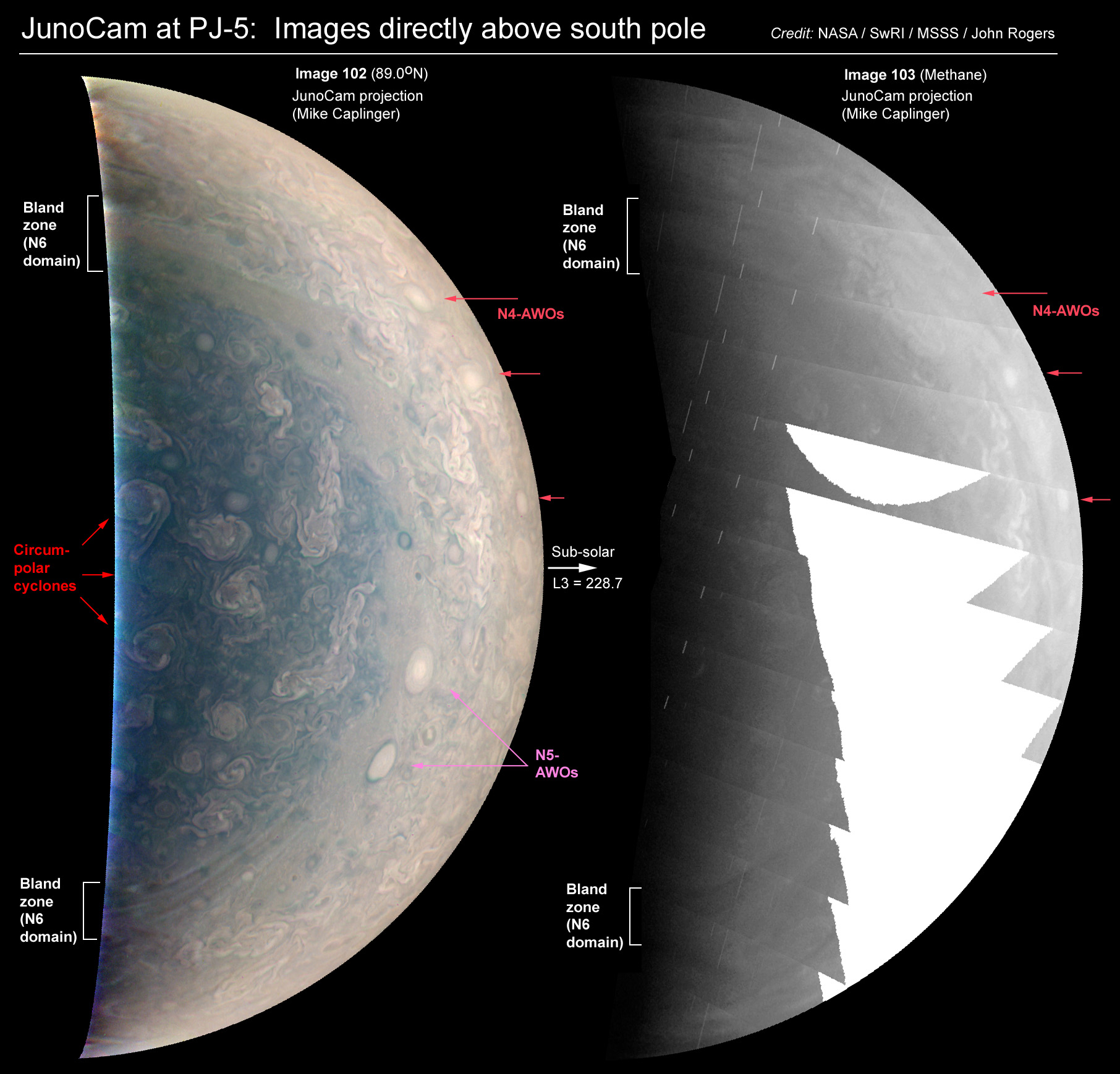 This is the view from directly over the north pole (colour image and methane image). The images confirm the features previously discovered by JunoCam, including: