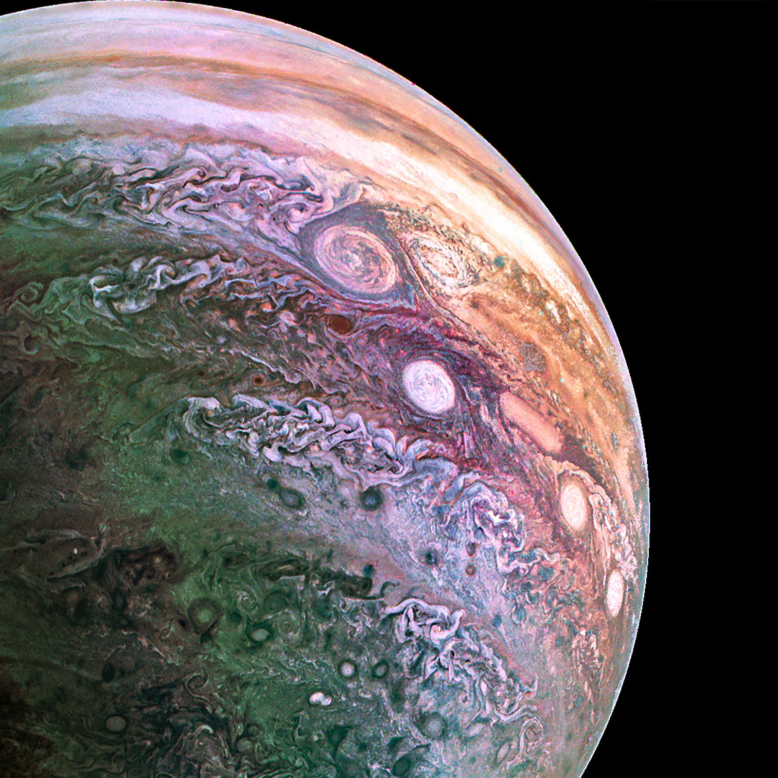 The counterclockwise rotating storms in the Southern Hemisphere are known as the Jovian *String of Pearls* caused by turbulent cloud layers attributed to the planet's rotation.