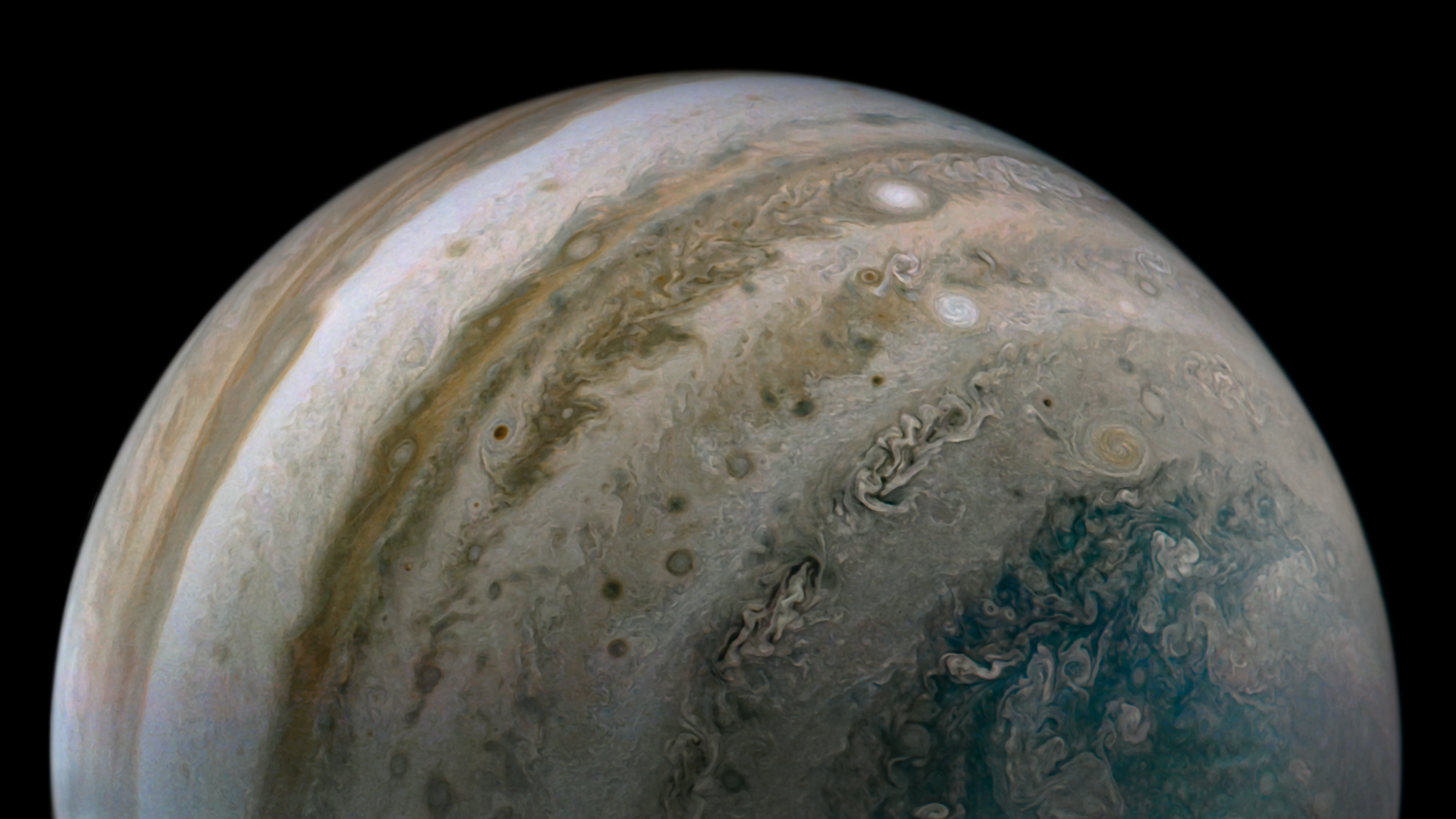 Processed using the JunoCam imager's PJ37 Southern Folded Filamentary Region raw images and data from NASA's Juno spacecraft flyby on October 16, 2021. Enhanced to highlight features, clouds, colours, and the beauty of Jupiter. Artist's impression - not representative of true colour.