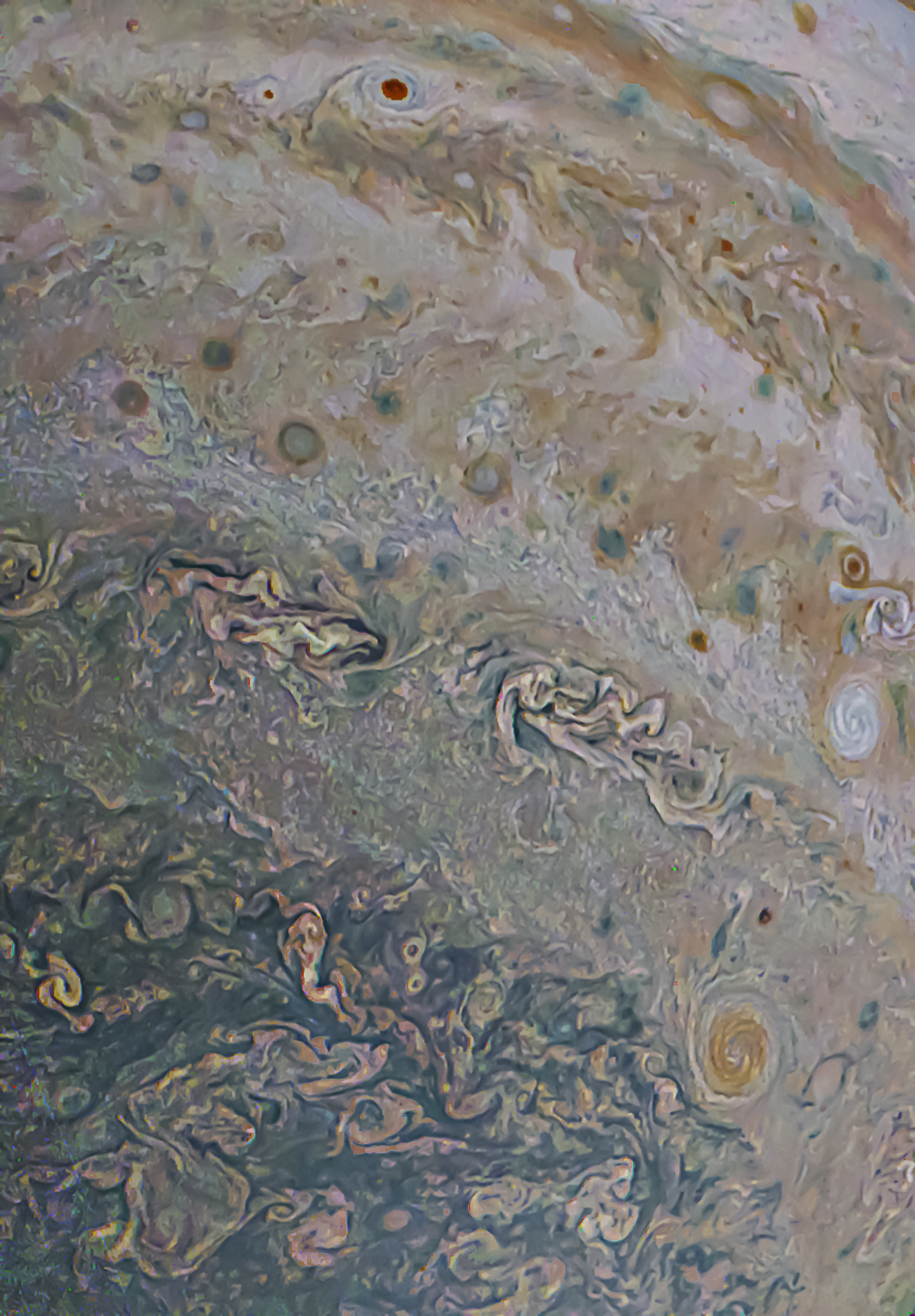 PJ37 Southern Folded Filamentary Region Cropped and enhanced. Shapes visible in this region reminds of a reptilian creature (Center Left), a ghost-like shape, sporting an almost perfect skull with shoulders and robe waving behind (Center-Right) and a serpent with a human head (bottom quarter - left of center) . Also a pretty red storm (Top Center) with its tiny side-kick tagging along.
