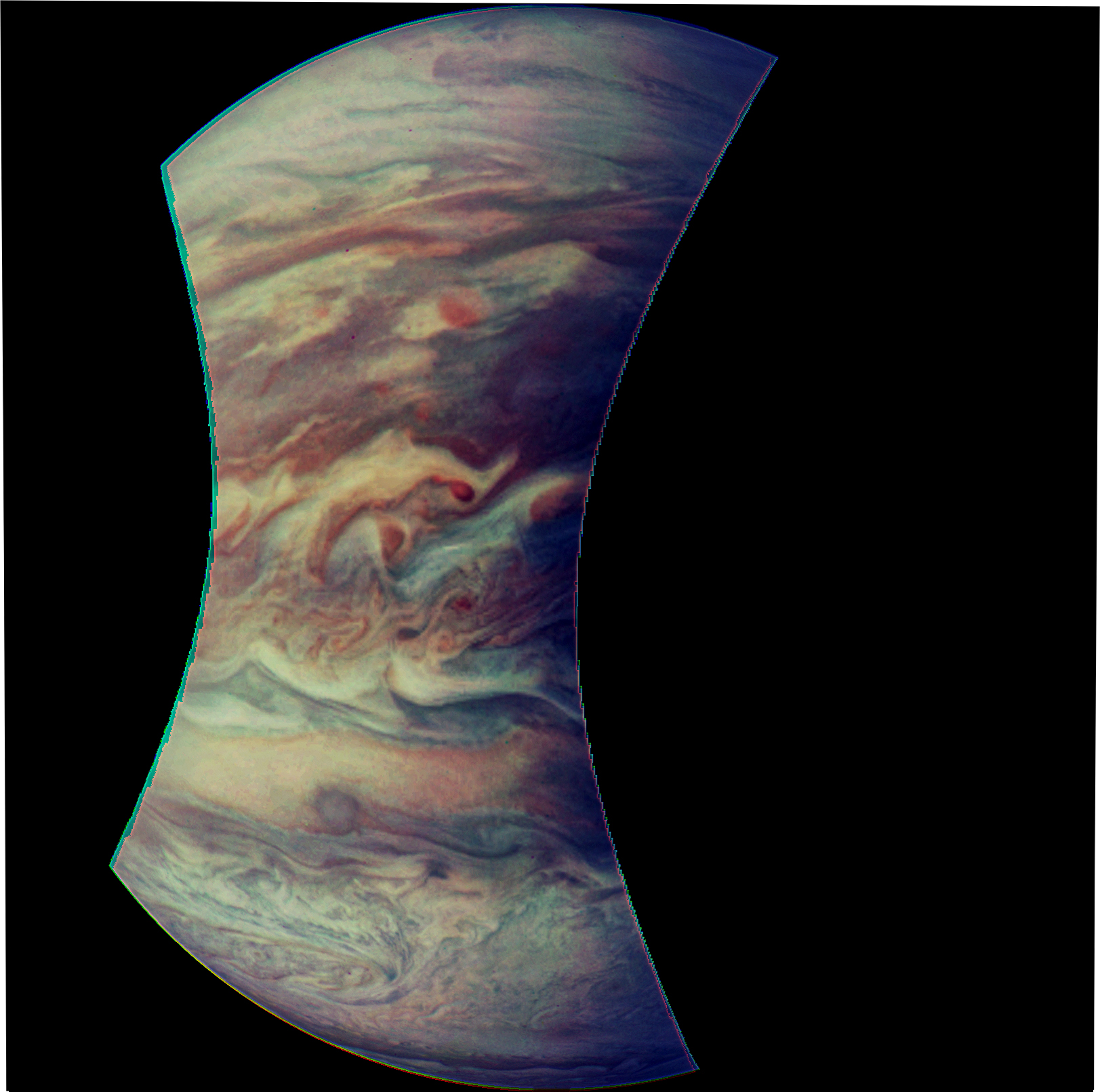 Junocam pixels are 12 bits deep from the camera but are converted to 8 bits inside the instrument using a lossless "companding" table, a process similar to gamma correction, to reduce their size. All Junocam products on the missionjuno website are in this 8-bit form as received on Earth. Scientific users interested in radiometric analysis should use the "RDR" data products archived with the Planetary Data System, which have been converted back to a linear 12-bit scale.