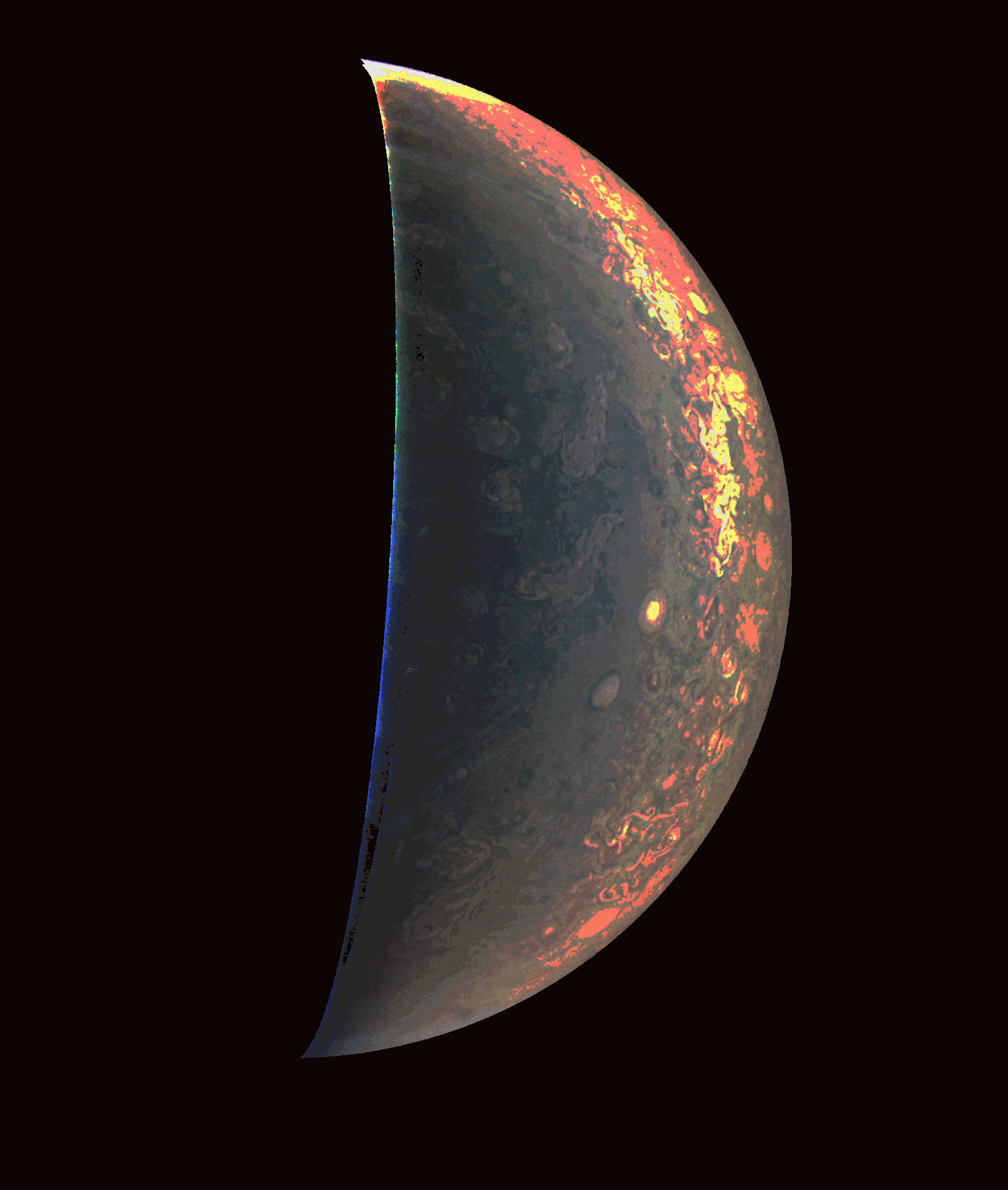 Using the projected maps from image sets 887-893, this animated gif looks to show either heat or light as Juno orbits around Jupiter