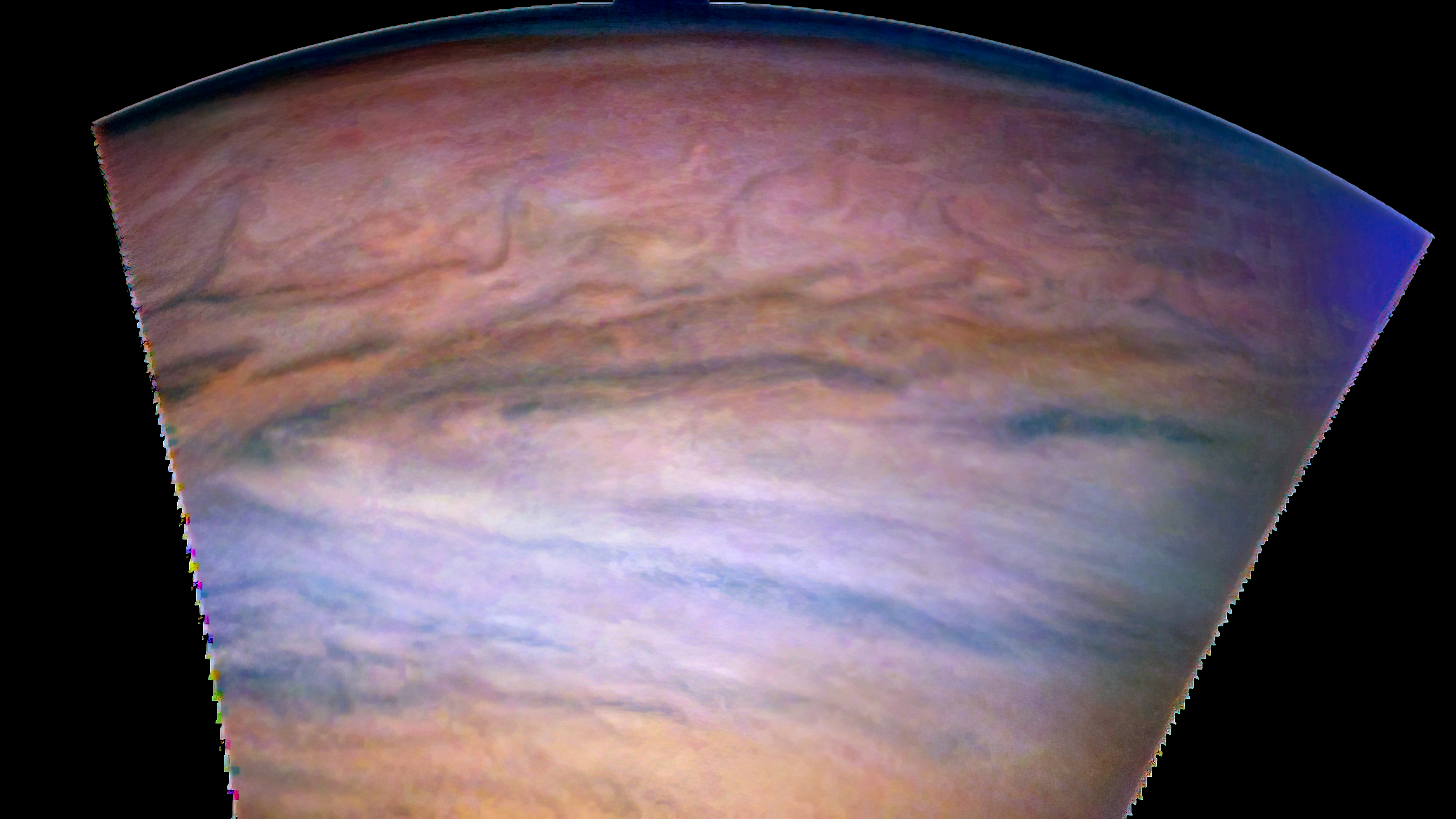 Junocam pixels are 12 bits deep from the camera but are converted to 8 bits inside the instrument using a lossless "companding" table, a process similar to gamma correction, to reduce their size. All Junocam products on the missionjuno website are in this 8-bit form as received on Earth. Scientific users interested in radiometric analysis should use the "RDR" data products archived with the Planetary Data System, which have been converted back to a linear 12-bit scale.