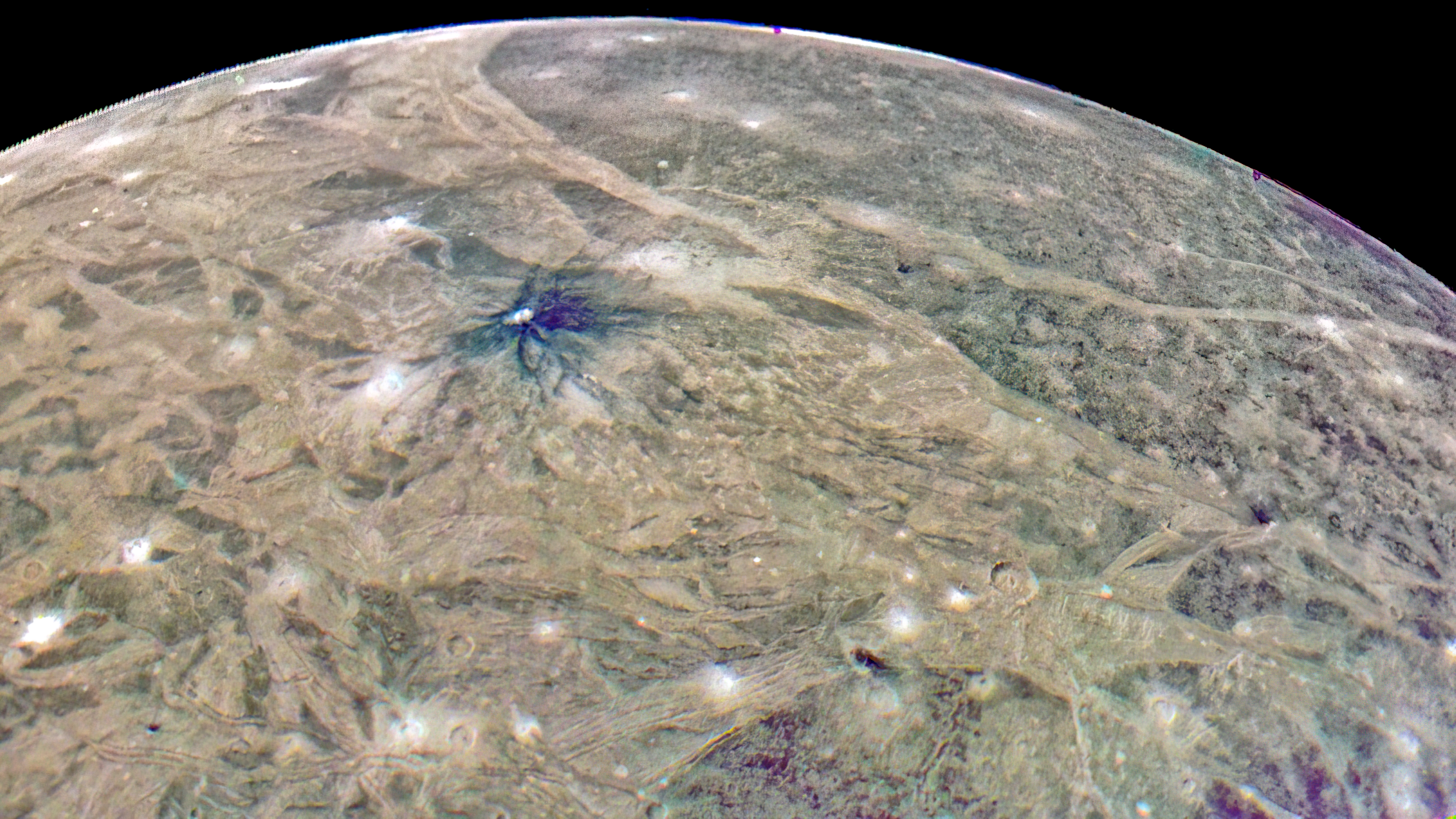 Junocam pixels are 12 bits deep from the camera but are converted to 8 bits inside the instrument using a lossless "companding" table, a process similar to gamma correction, to reduce their size. All Junocam products on the missionjuno website are in this 8-bit form as received on Earth. Scientific users interested in radiometric analysis should use the "RDR" data products archived with the Planetary Data System, which have been converted back to a linear 12-bit scale.