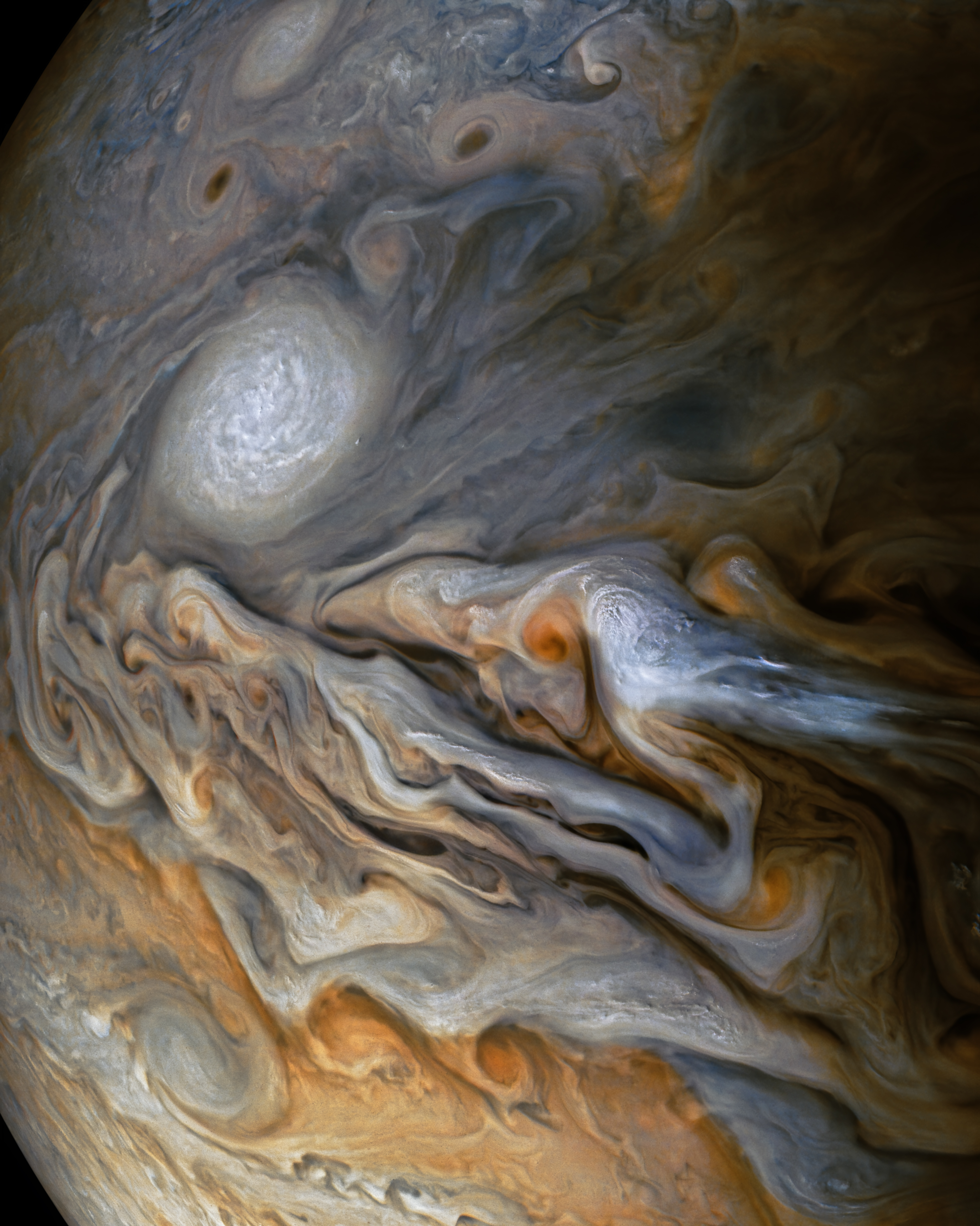This particular image was inspired by the iconic one produced by Gerald Eichstädt and Seán Doran ( https://photojournal.jpl.nasa.gov/catalog/PIA22692 ). An impressive panorama of the North North Temperate Belt captured during Perijove 16 of the intricate cloud structures, where you can almost feel the volume of the atmospheric masses. What seems to be the top of the enormous structure at the right of the center is crowned by eye-catching clouds that look very much like ours here at the Earth. This framing is slightly wider than Eichstädt&Doran's version.