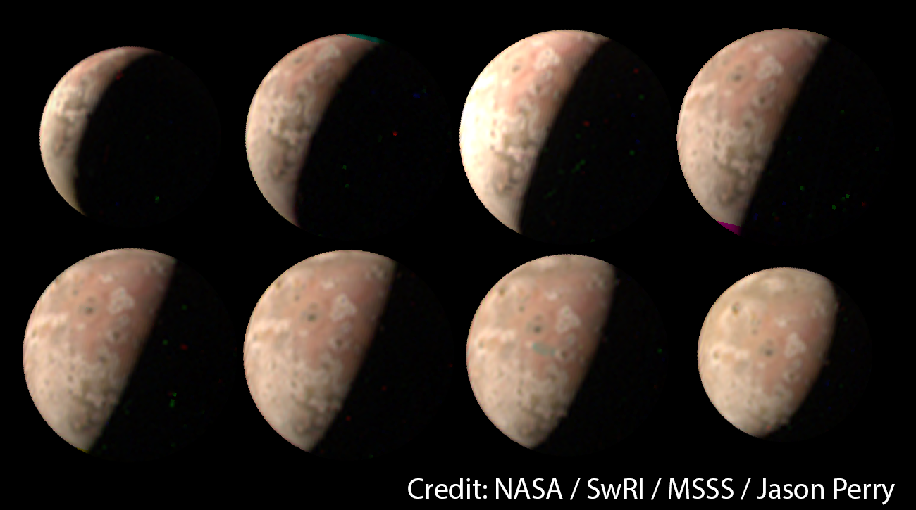 On July 5, 2022, Juno performed a "Voyager-class" encounter with Io a set of eight of Io's northern hemisphere near closest approach (two others were also acquired but were on the edge of the frame so are not included here). The images shown here are in time order with the crescent view at top left taken 33 minutes before closest approach and the gibbous view at bottom right taken 38 minutes after closest approach.