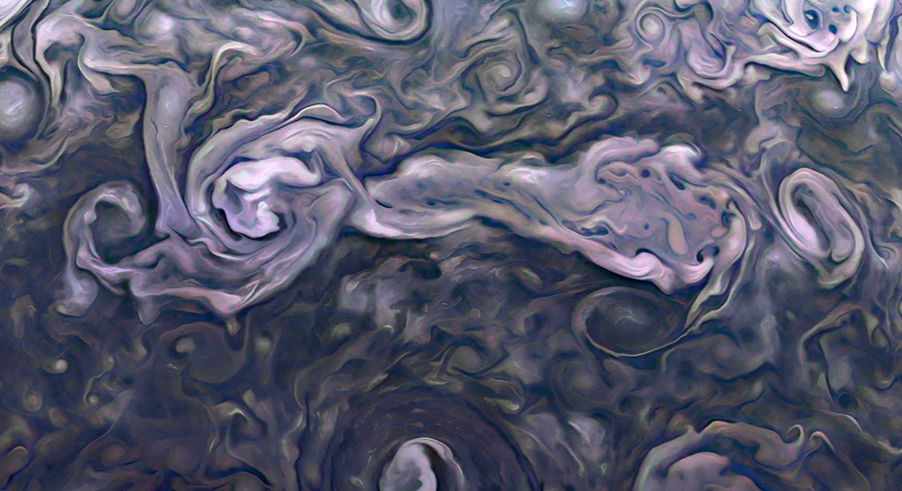 Crazy clouds in the North pole of Jupiter - PJ44. Created from PJ44-39 raw image. Highly exaggerated detail and color.
