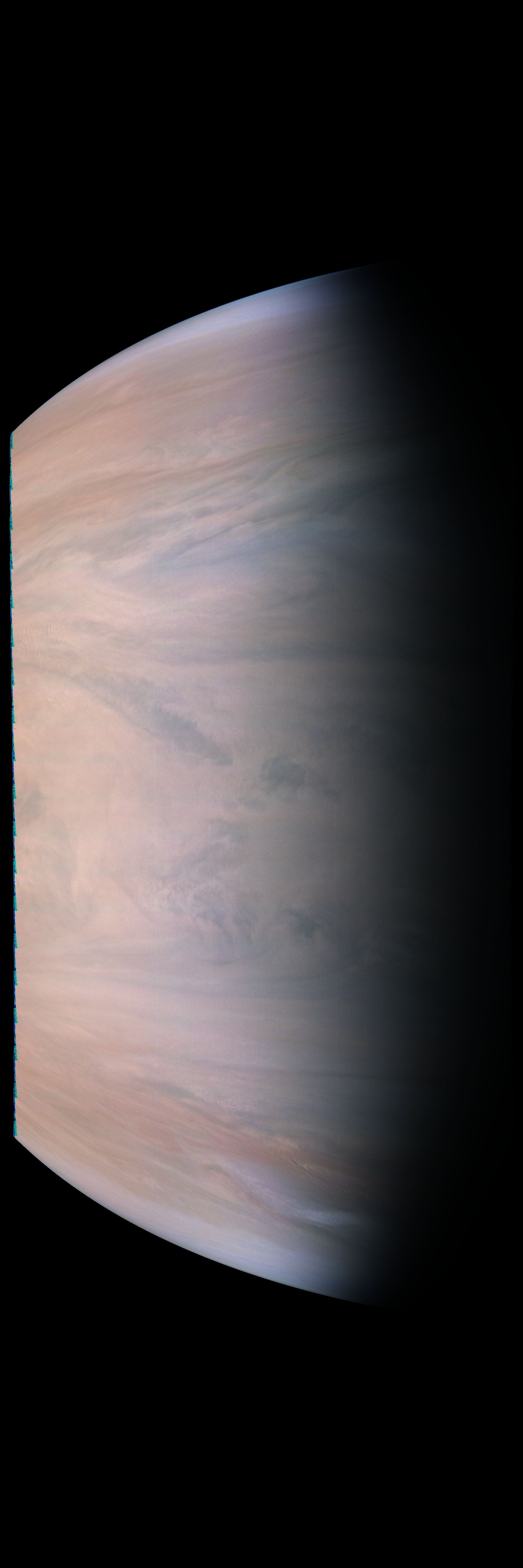 Resolution is 30 pixels per degrees in an equidistant cylindrical system centered to the camera at image stop time, with an axis parallel to Juno's spin axis. The rendered field of view is 60x180 degrees.