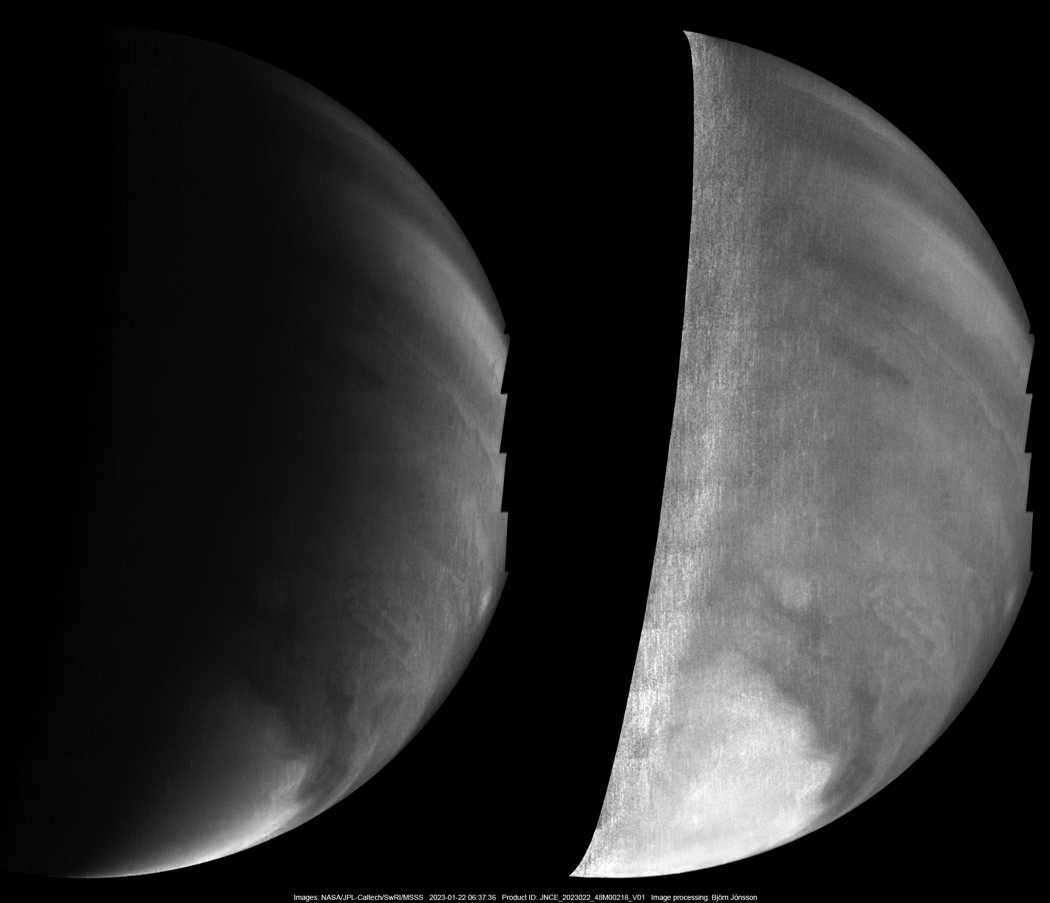 An image obtained with JunoCam's methane filter. The version at left is the image with no special processing. The version at right is illumination-adjusted. This reveals some details closer to the terminator than in the image at left. Even closer to the terminator, only noise is visible in the image. In both cases the images were processed to reduce noise since the methane filter images are usually very noisy. North is up.