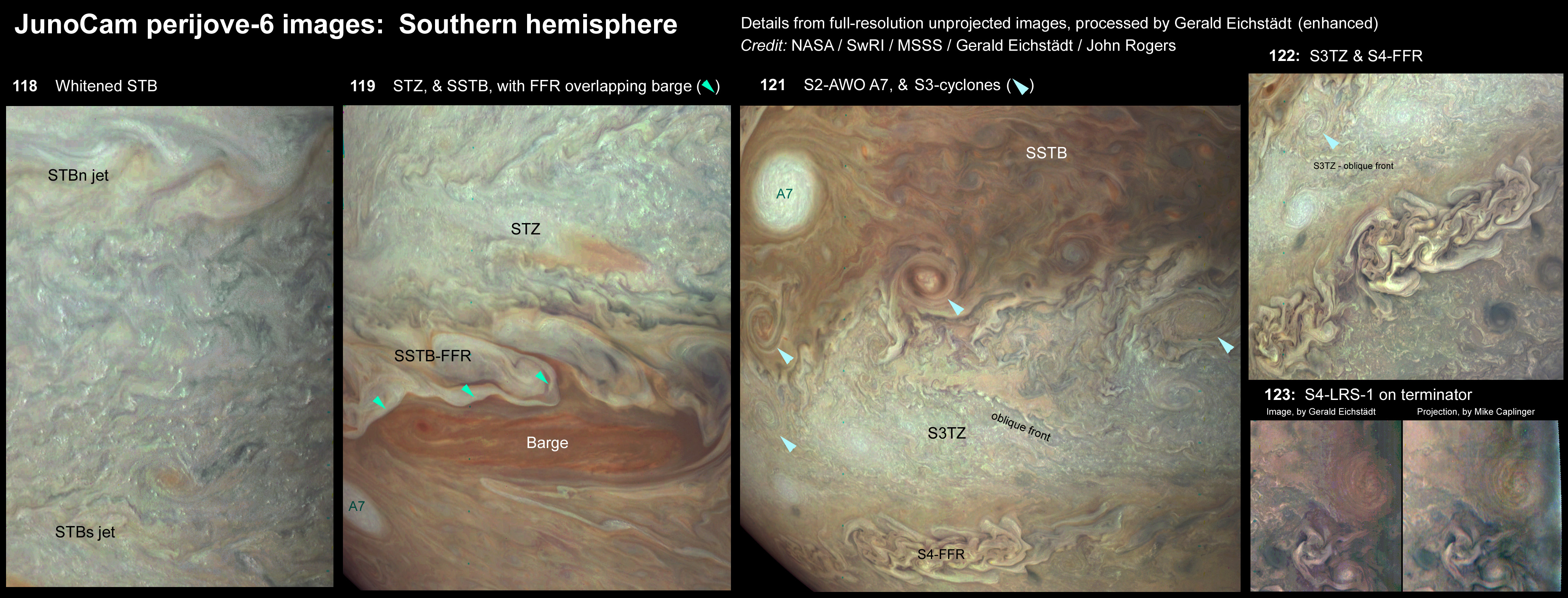 Annotated and enhanced clips from the full-scale images as processed by Gerald. Descriptions are given in our report on the BAA Jupiter Section web site at: https://www.britastro.org/node/7982. --John Rogers.