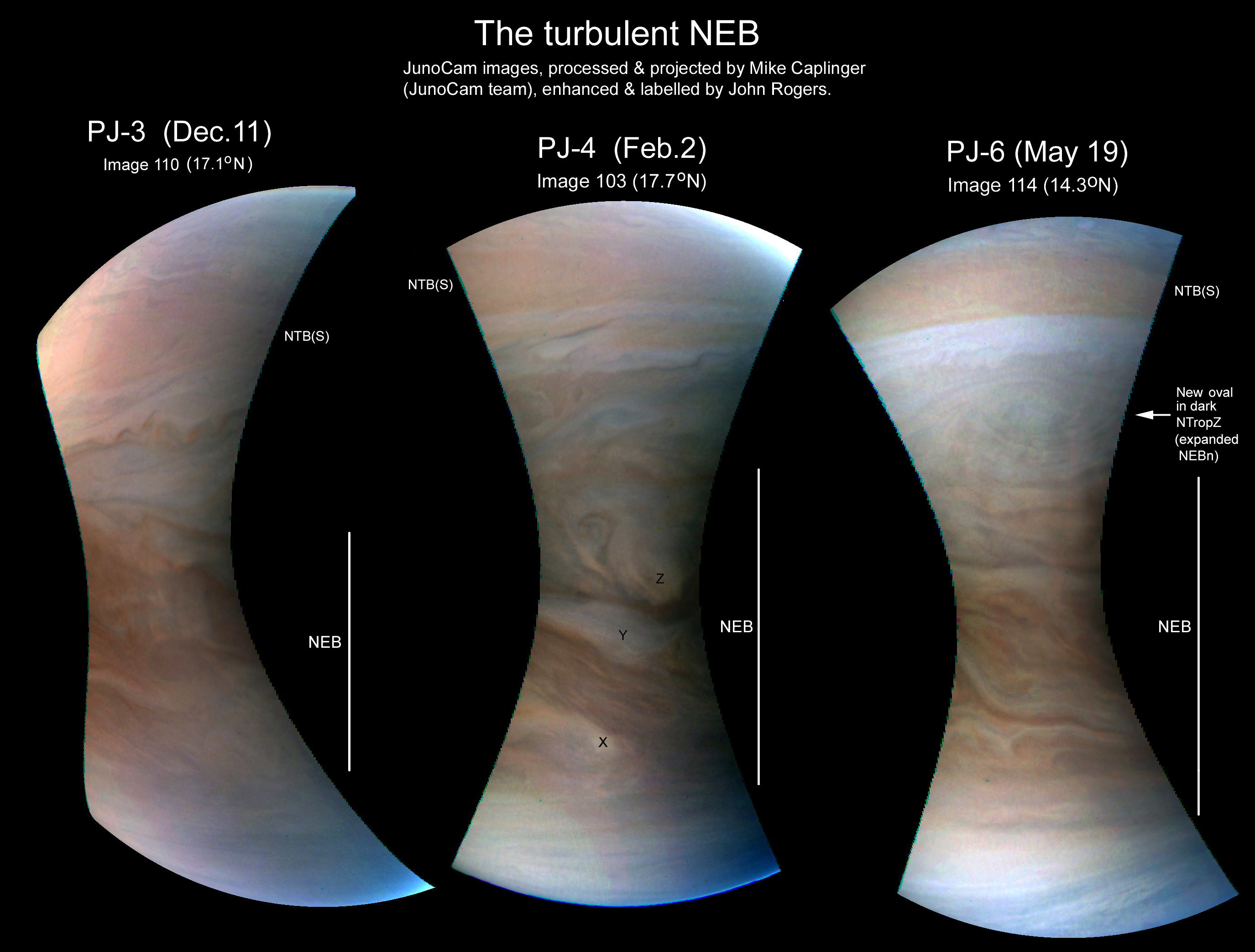 The NEB has undergone extensive outbreaks of convective white spots (‘rifts’), and the PJ3 image was just preceding a new bright rift. The PJ4 image showed several bright rifts (X,Y,Z). The PJ6 image shows a less disturbed sector, but unexpectedly captures a striking anticyclonic vortex in the expanded northern NEB, apparently a new feature. –John Rogers.
