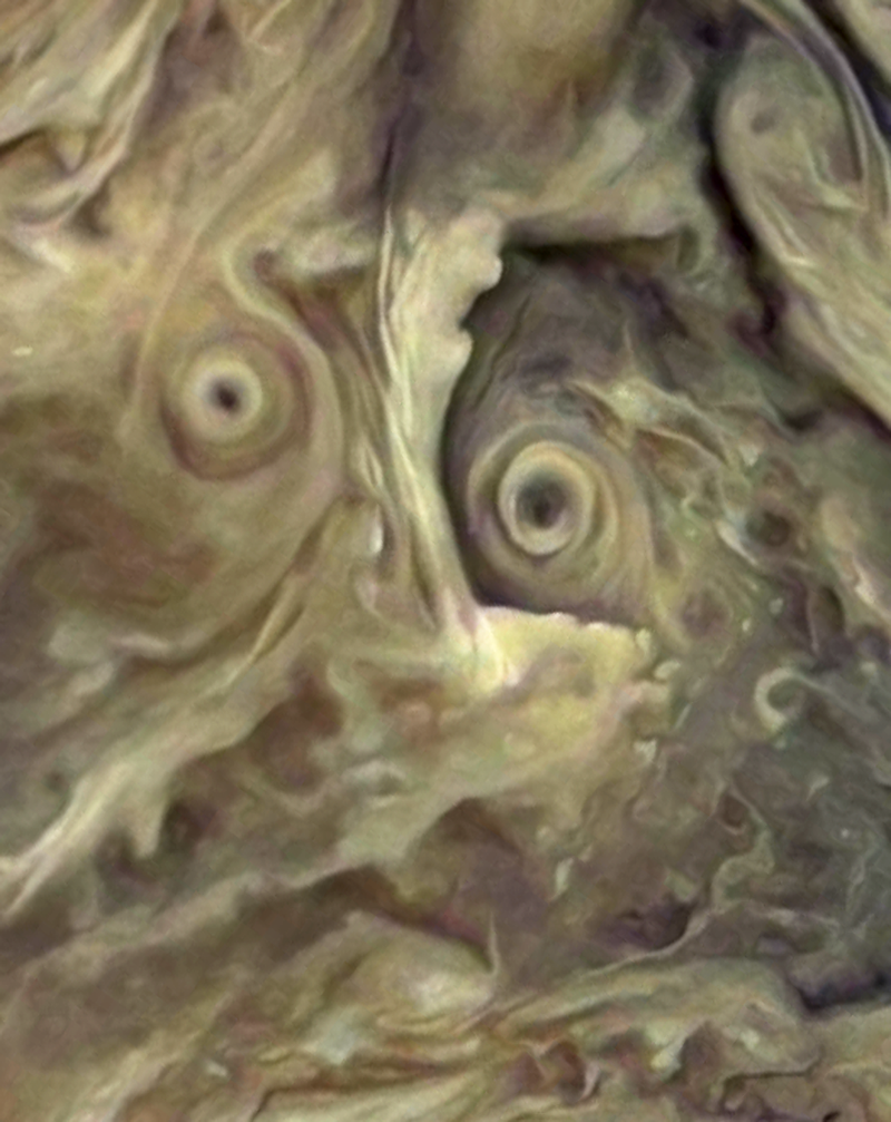 Part of an image of the Circumpolar Cyclone on Jupiter appears to resemble a face with two eyes, as captured by the Junocam on April 8th, 2023 (PJ50). Enhanced using G'Mic QT on GIMP