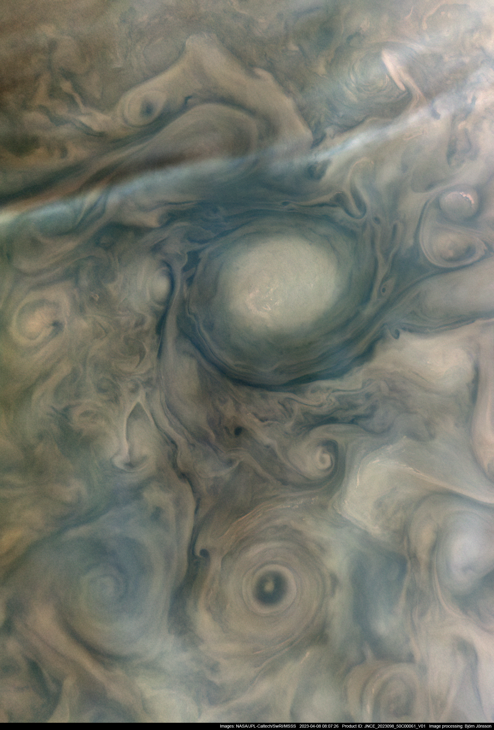 An enhanced image processed from the PJ50_61 raw image framelets. The contrast has been increased and small scale features sharpened. North is up. The large oval is centered at planetographic latitude 62 degrees north. Several haze bands (one prominent, the other ones more subtle) are visible in this image.