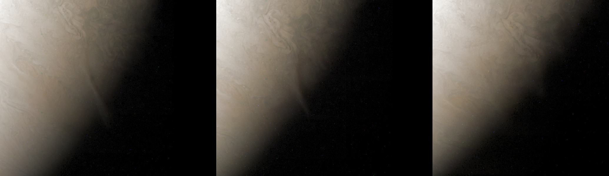 The immediate comparison of the hazes on both sides of the mean terminator helps to distinguish a little better mere shading or varying albedo within the high-altitude hazes from true shadows on the cloud-tops.