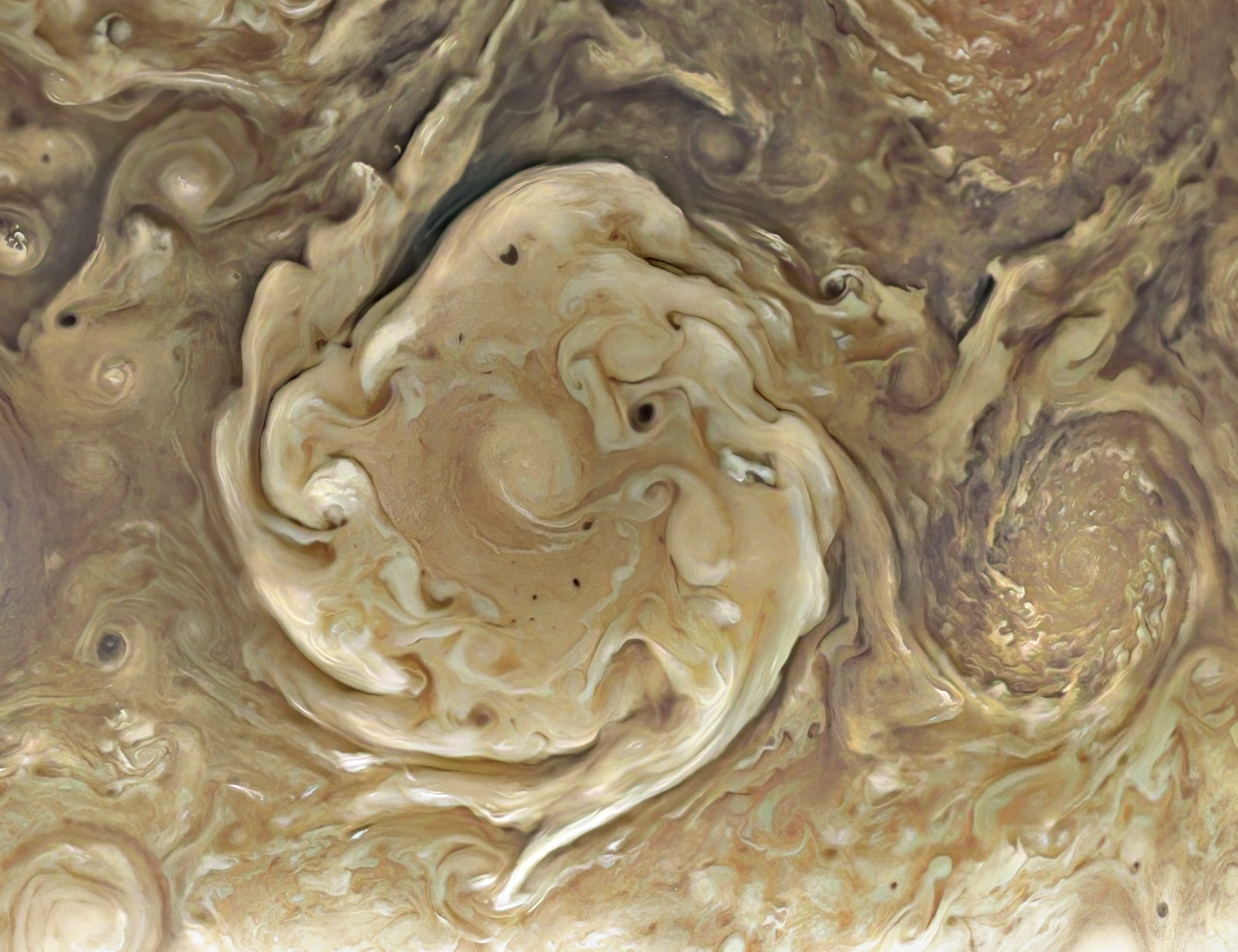 PJ52: Northern Circumpolar Cyclone in Enhanced False Color. Created from a raw image captured by JunoCam on June 23, 2023. Enhanced using GIMP and G'Mic-Qt