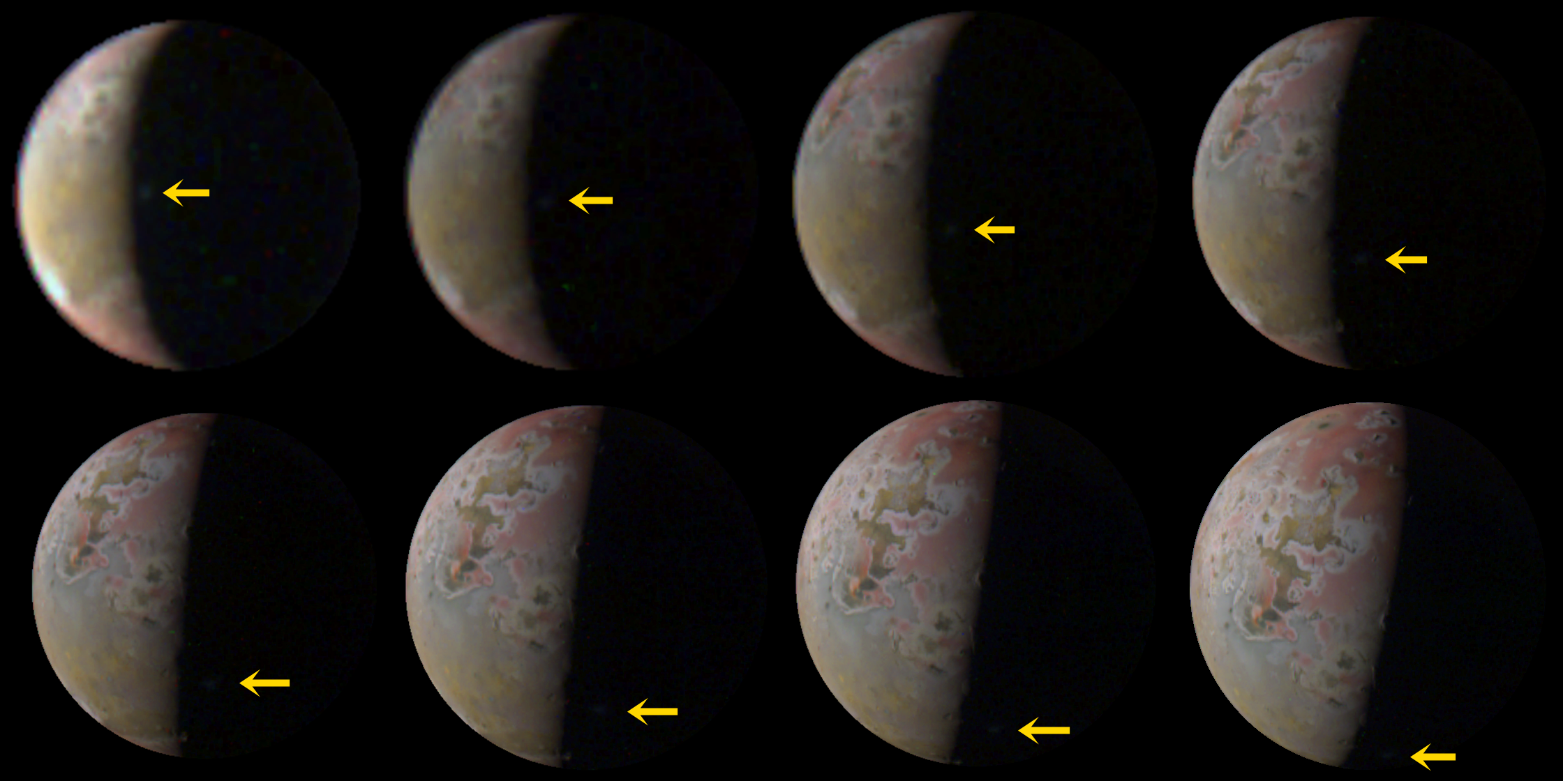 A brighter feature along the terminator, and visible below Prometheus in about five of the images, coincides with the position of Tohil Mons near 160°W 30°S.