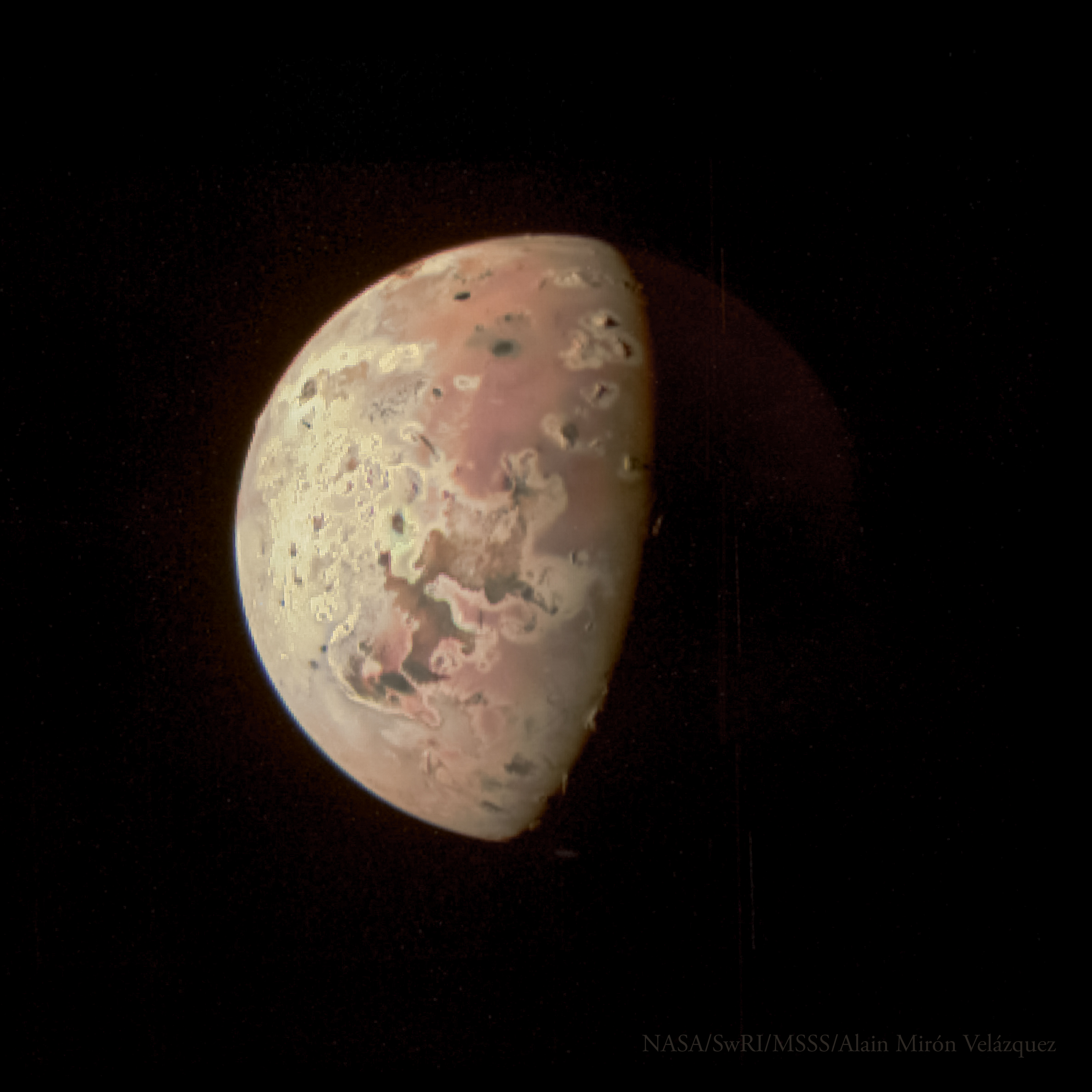 Ío, vista de cerca por Juno, se aprecia una columna eruptiva en la zona inferior del satélite, asociada a la actividad de Prometheus patera, así como la luz cenicienta de Ío.