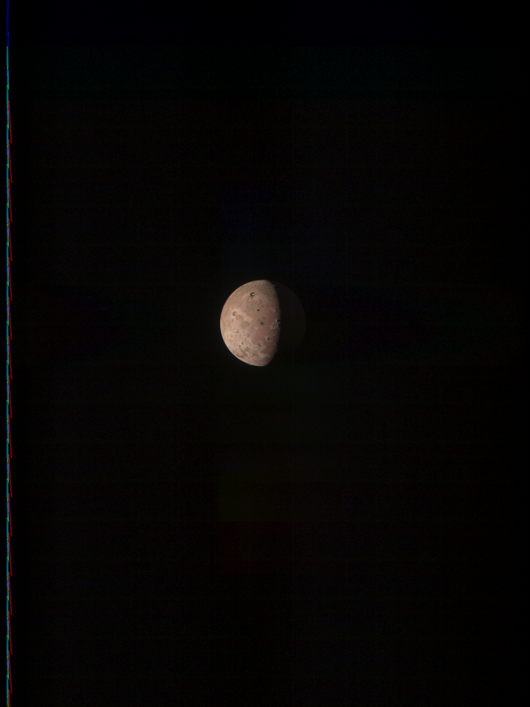 The image contains camera artefacts and energetic particle hits. After considering this, on the other hand, it may also show features on Io, or next to it, that may be clipped from reprojected images.